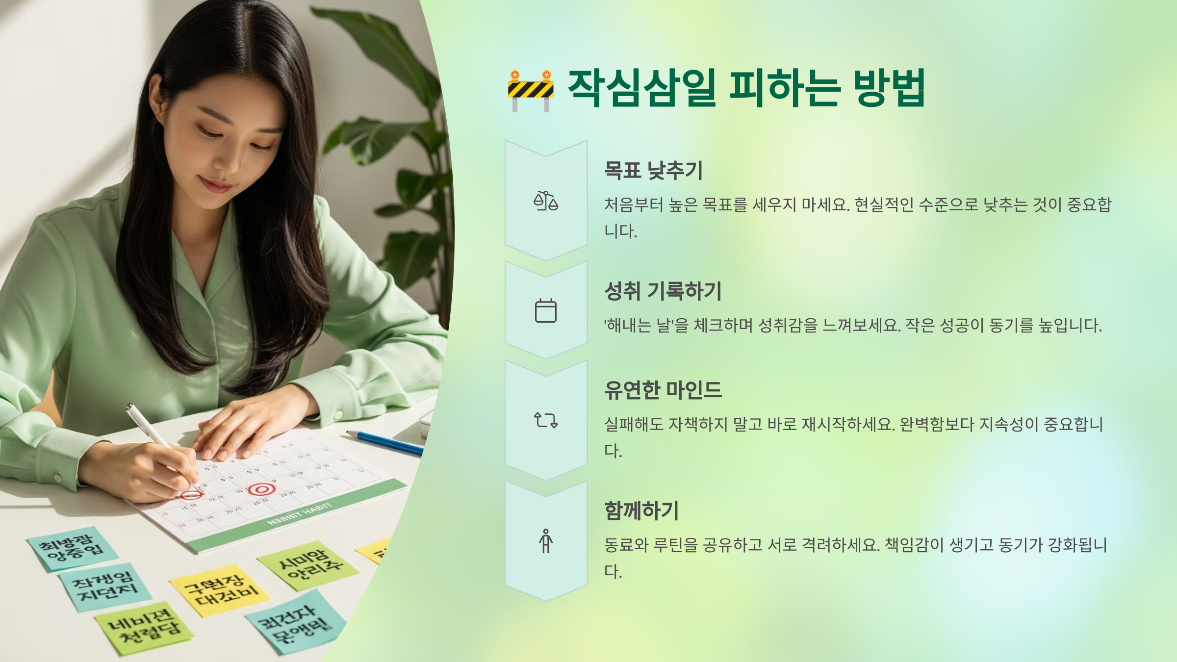 🧱 이제 ‘작심삼일’을 어떻게 피하고, 오래 지속할 수 있는지 알아볼 시간이에요! 다음 섹션에서 함께 볼게요!