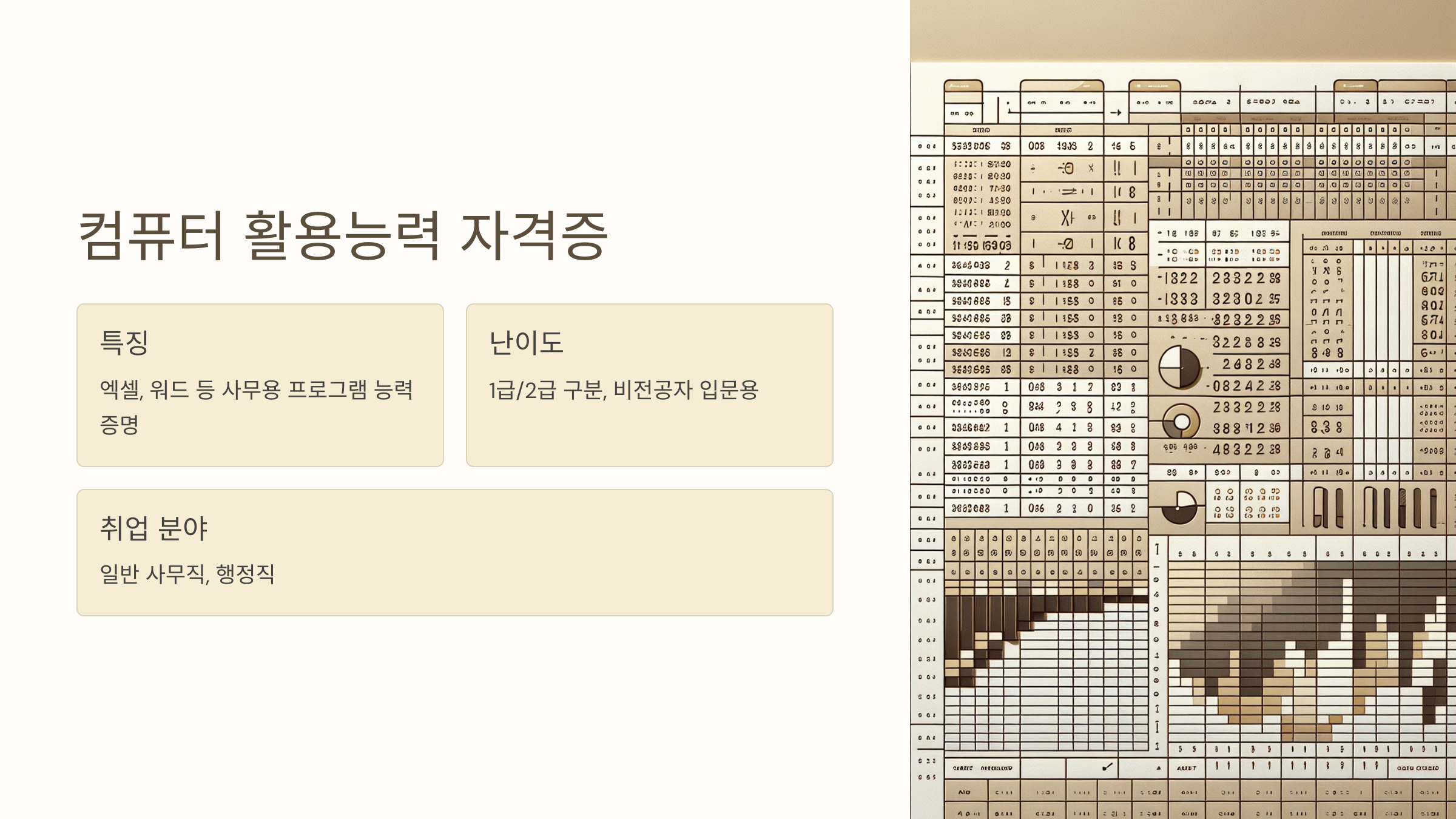 예를 들어, 문서 작성, 데이터 분석, 프로세스 자동화, 웹 관리, 네트워크 기초, 보안 개념, UX 디자인 같은 분야가 있어요. 요즘은 어느 업무에서나 컴퓨터를 잘 다루는 능력이 중요하니까, 이런 자격증은 문과 출신이나 예체능 전공자에게도 유리하게 작용하죠.