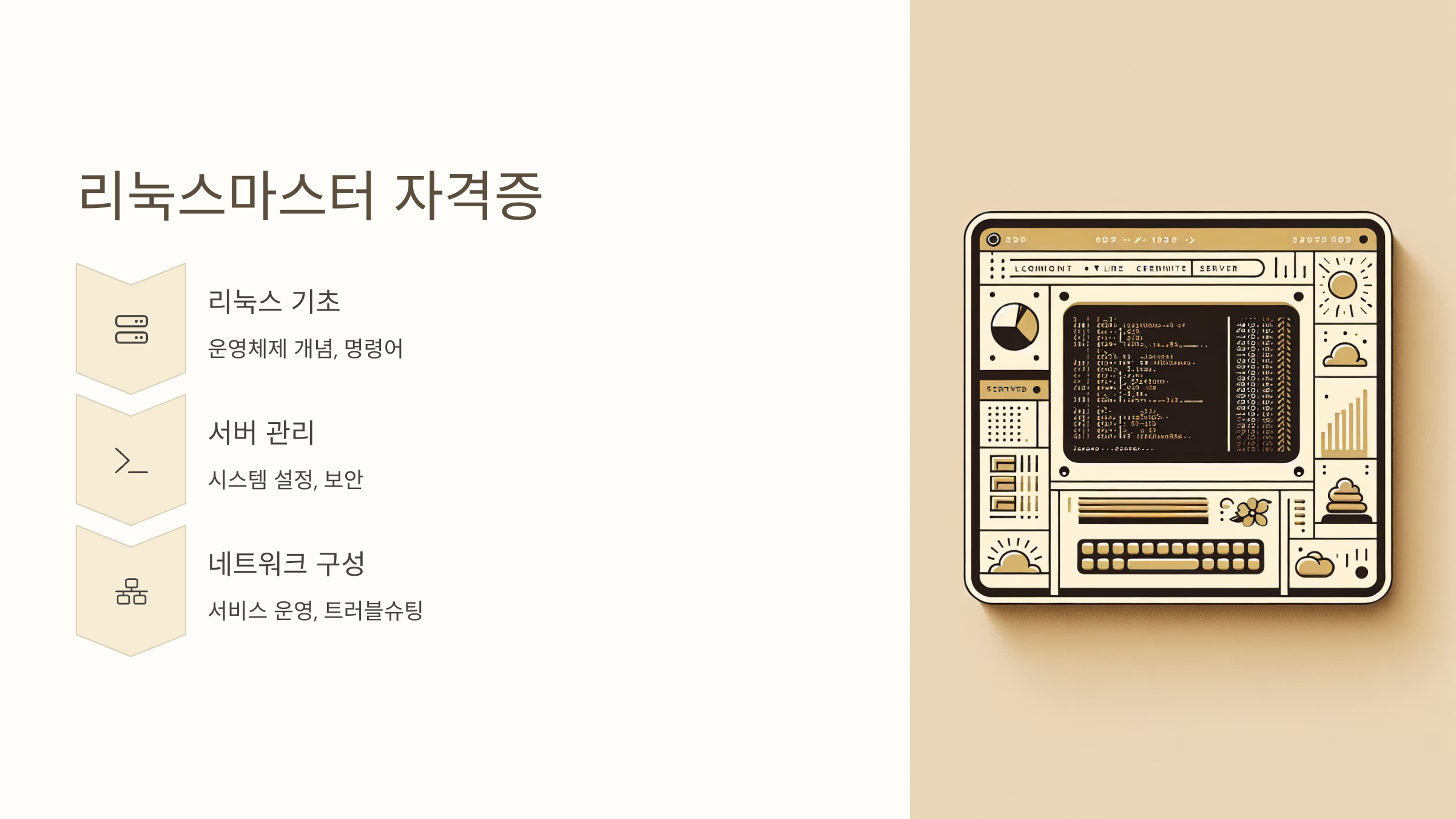 리눅스마스터 자격증은 오픈소스 운영체제인 리눅스에 대한 이해를 바탕으로 서버 관리와 시스템 운영을 다룰 수 있는 능력을 평가하는 시험이에요. 특히 비전공자가 서버 운영 개념을 익히기에 정말 좋은 자격증이에요. 💻