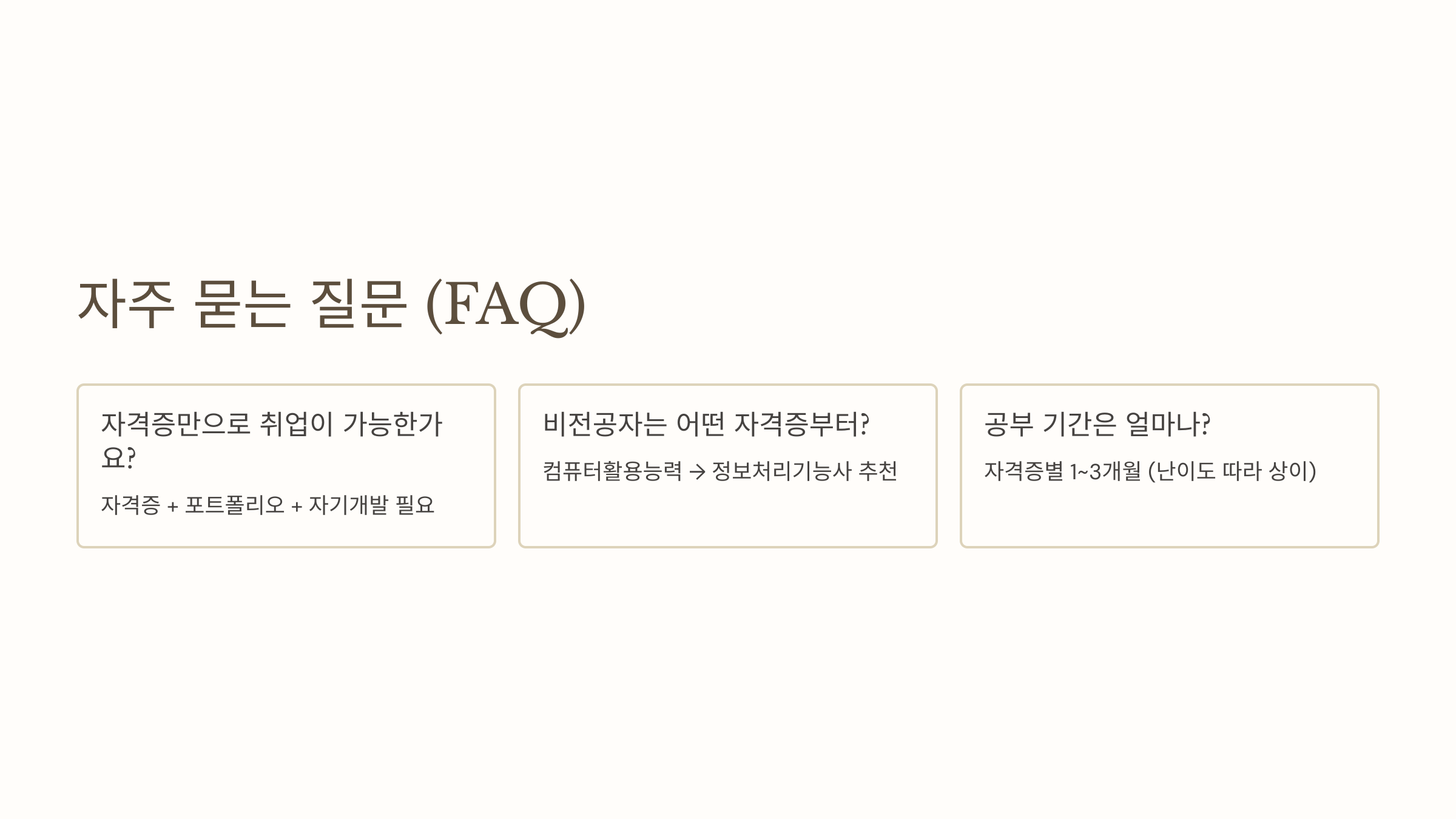 내가 생각했을 때 이 자격증들이 좋은 이유는, 결과적으로 커리어의 문을 여는 ‘도구’가 되기 때문이에요. 경력도 없고 전공도 안 맞는다면, 자격증으로 나를 증명하는 것도 훌륭한 전략이에요.