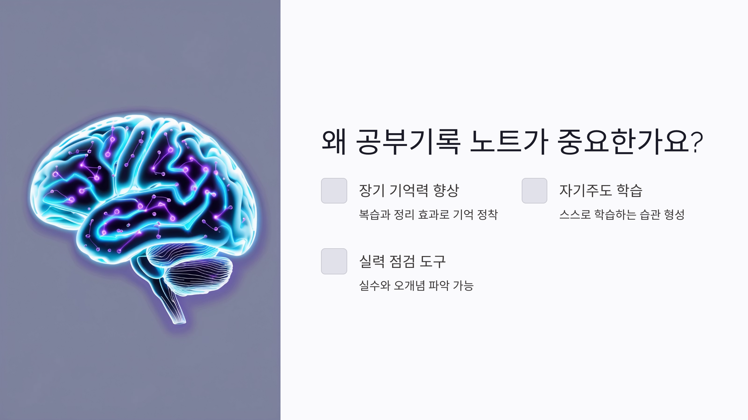 공부기록 노트의 가장 큰 힘은 '되돌아볼 수 있는 나만의 데이터'라는 점이에요. 공부하면서 느꼈던 감정, 어려웠던 개념, 깨달은 포인트들을 글로 정리해두면, 반복학습 없이도 복습 효과를 볼 수 있어요.