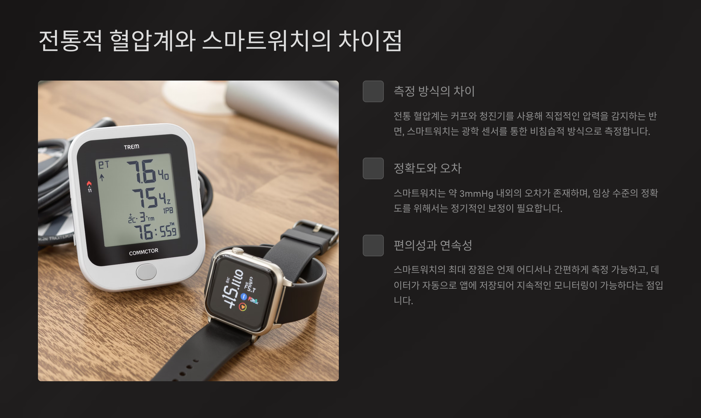 | 전통 커프 방식 | 정확도 높음, 의료 기준 사용 |