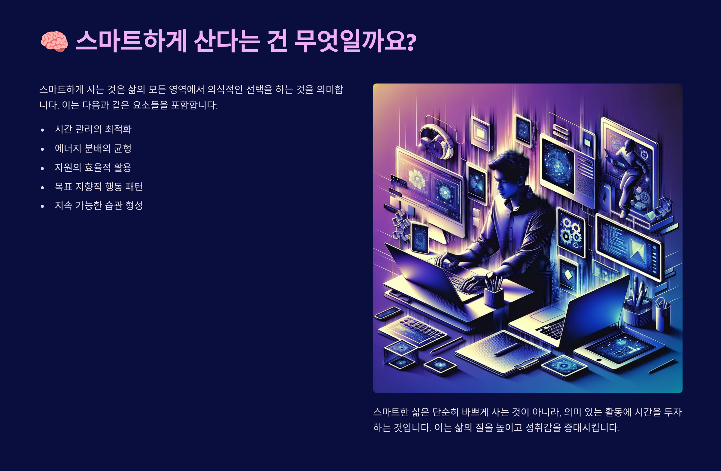 스마트하게 산다는 건 단순히 많은 일을 해내는 게 아니라, 효율적으로 에너지를 관리하는 법을 아는 거예요.