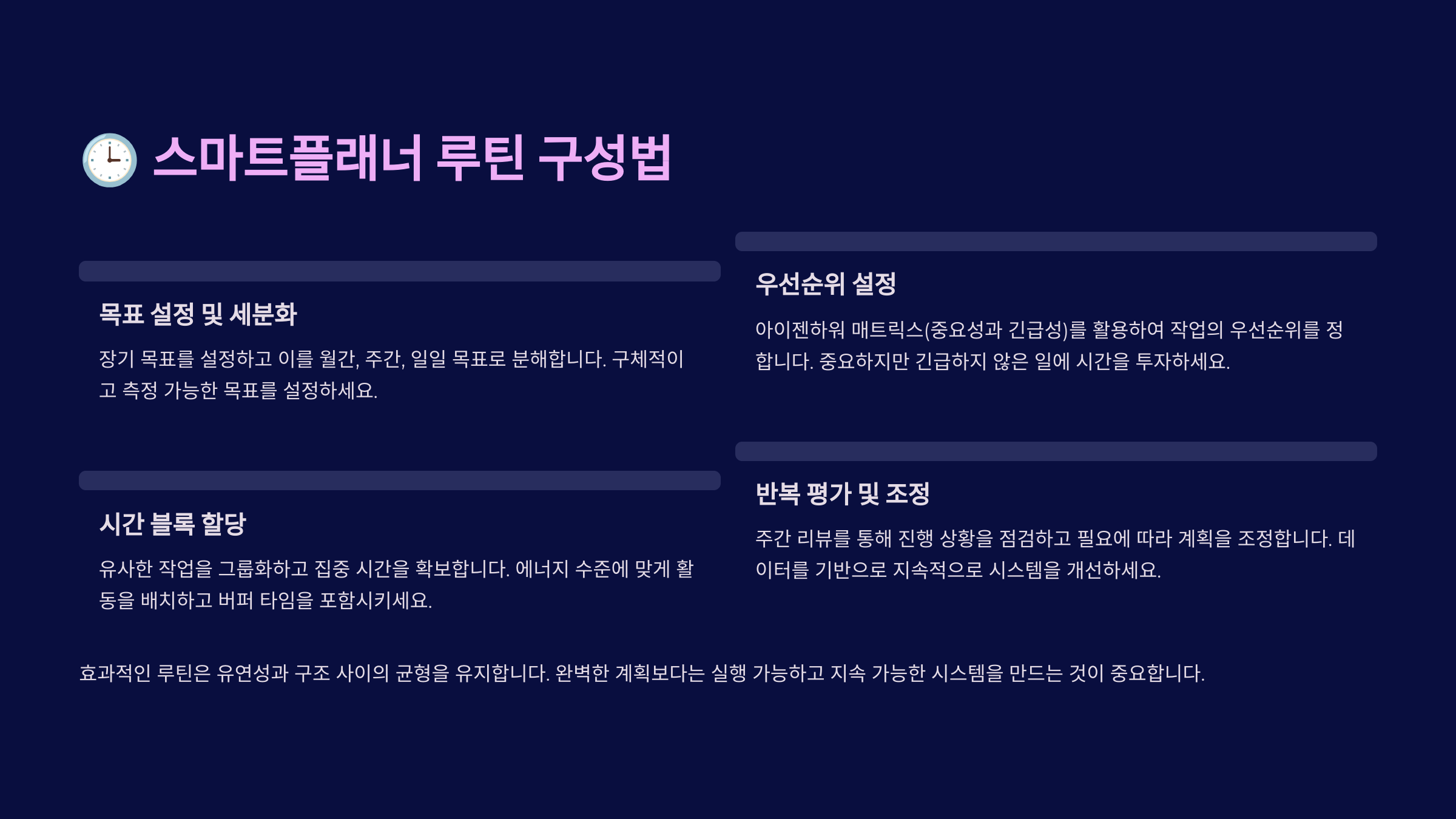 - 🧩 블록 타임 루틴: 업무·학습·휴식 시간을 블록화해 몰입도 상승