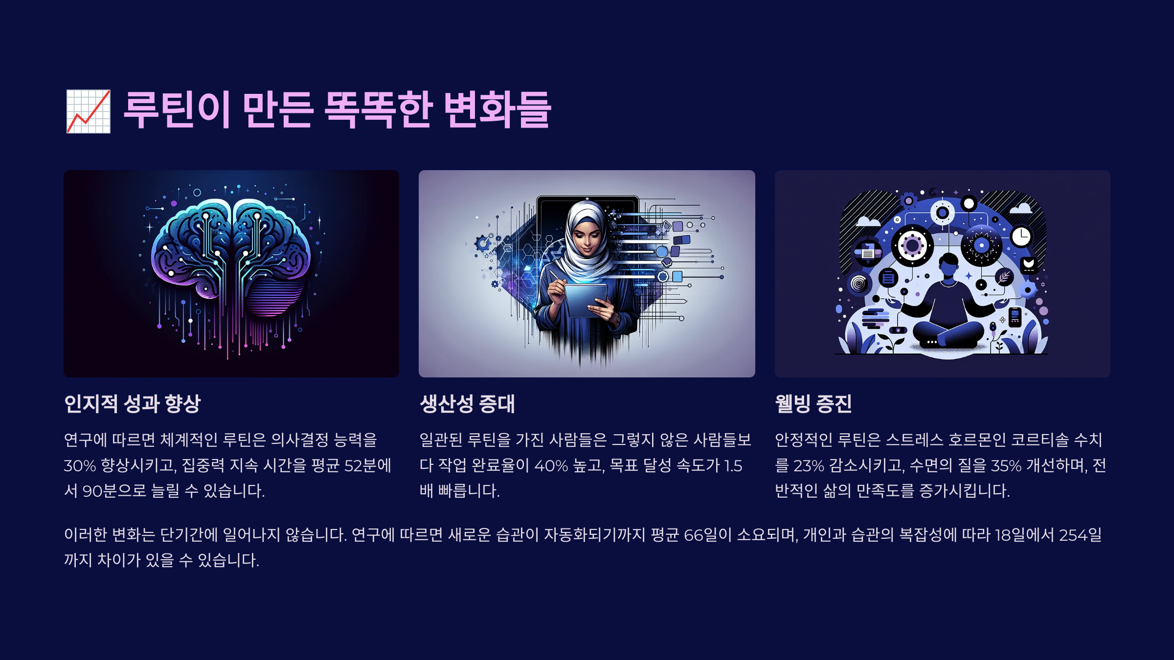 그래서 루틴을 단순한 ‘작심삼일’로 끝내지 않고, 습관으로 진화시킬 수 있어요. 👍