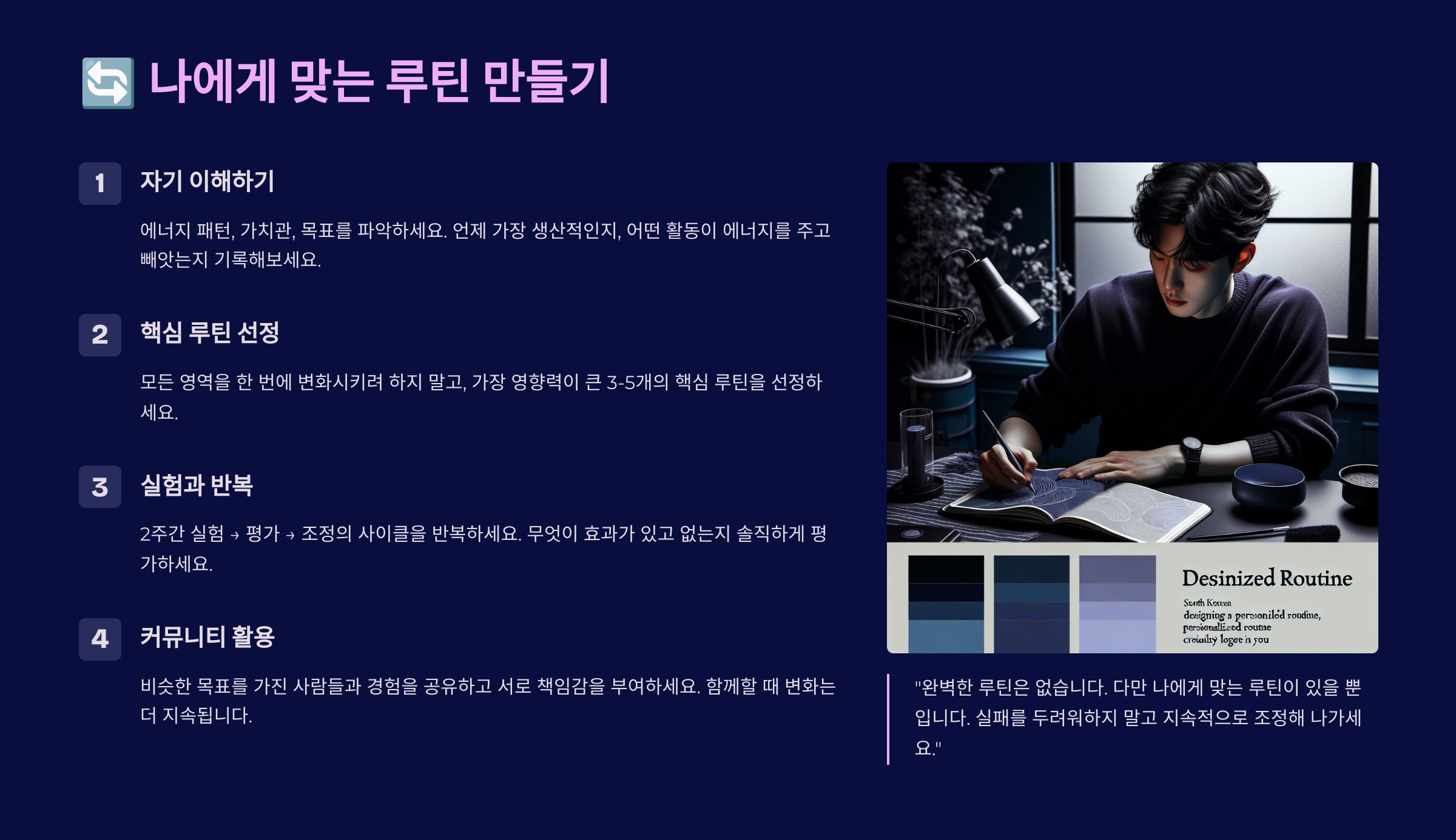 핵심은 나에게 맞게 루틴을 설계하는 거예요. 남의 루틴을 따라 하기보다, 내 리듬에 맞는 방식을 찾아야 해요.