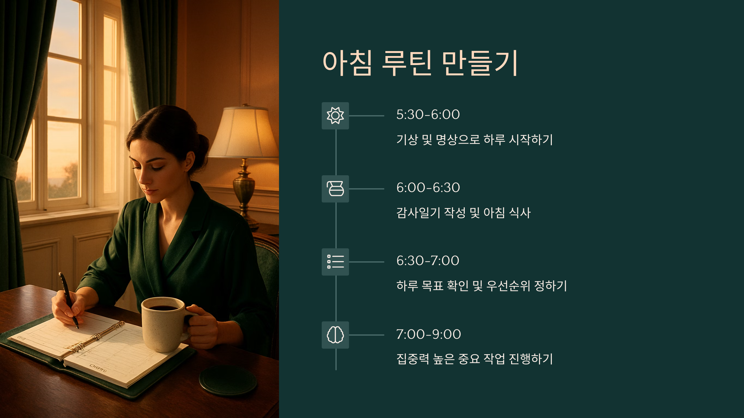 많은 성공한 사람들이 입을 모아 이야기하는 게 하나 있어요. 바로 "하루를 지배하려면 아침을 지배하라"는 말이에요. 아침은 집중력과 의지력이 가장 높은 시간대로, 이 시간을 어떻게 쓰느냐에 따라 하루 전체의 분위기가 결정돼요. 그래서 스마트플래너에서 가장 먼저 정리해야 할 루틴도 바로 아침 루틴이에요.