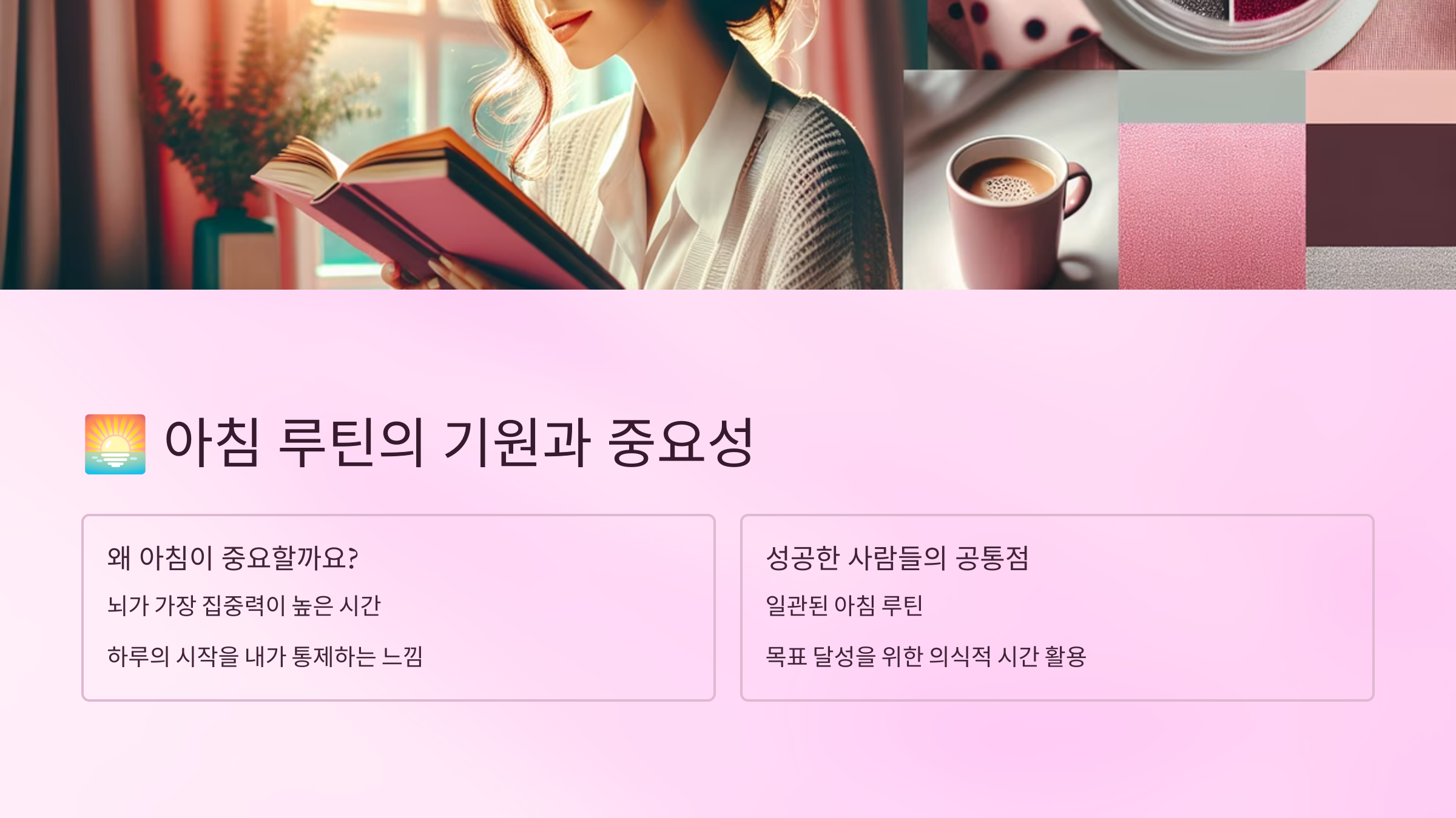 아침 시간은 하루 중 가장 조용하고 방해받지 않는 소중한 시간이죠. 뇌가 밤새 회복을 마치고 가장 맑은 상태가 되기 때문에, 집중력과 정보 흡수력이 최고조에 달하는 순간이에요. 이런 이유로 전 세계의 성공한 인물들 대부분이 아침 시간을 자기 계발에 활용한다고 알려져 있어요.