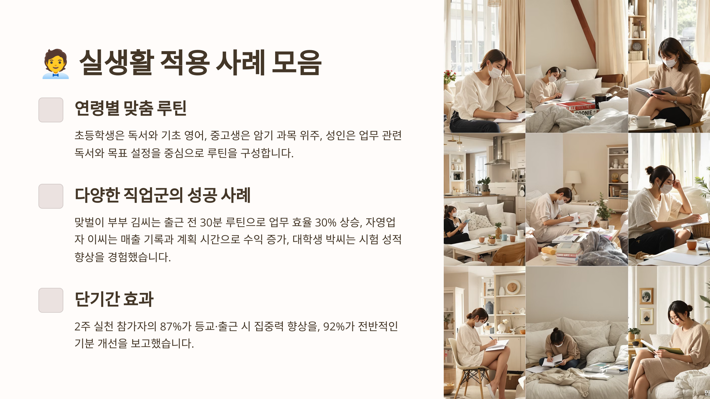 또 루틴을 실천한 사람들은 시간 관리 능력이 월등히 향상돼요. ‘이 시간엔 이걸 한다’는 구조가 생기면서 전반적인 하루 설계가 효율적으로 바뀌어요. 당연히 공부든 일이든 성과도 더 높아질 수밖에 없죠.