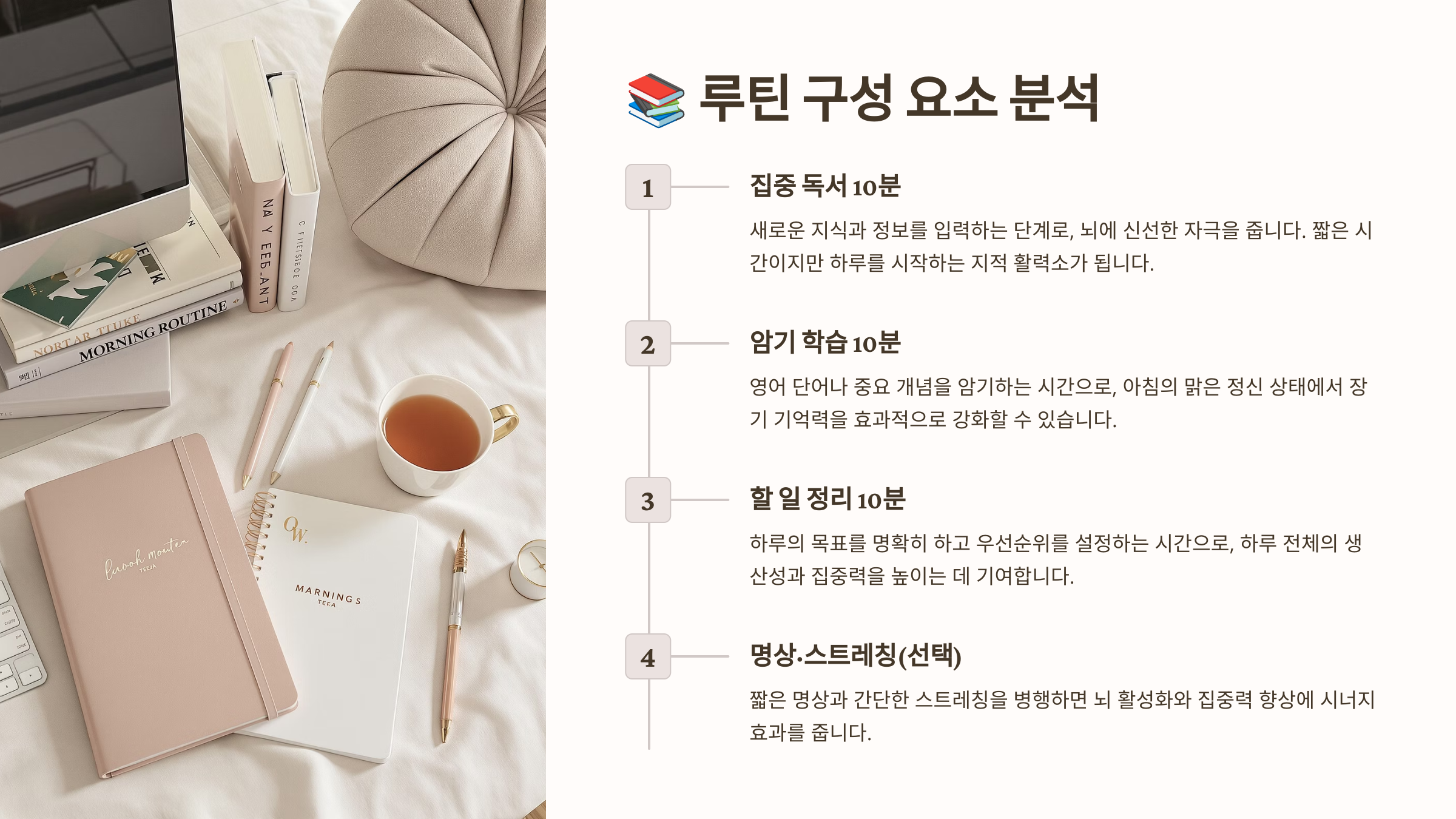 아침 루틴을 꾸준히 반복하면, 뇌는 특정 시간대에 자동으로 공부 모드로 전환돼요. 이건 일종의 조건반사처럼 작용하면서 ‘공부 습관’이라는 강력한 무기를 만들어주죠. 이제 이 루틴을 어떻게 구성하는지 구체적으로 알아볼까요? 😊