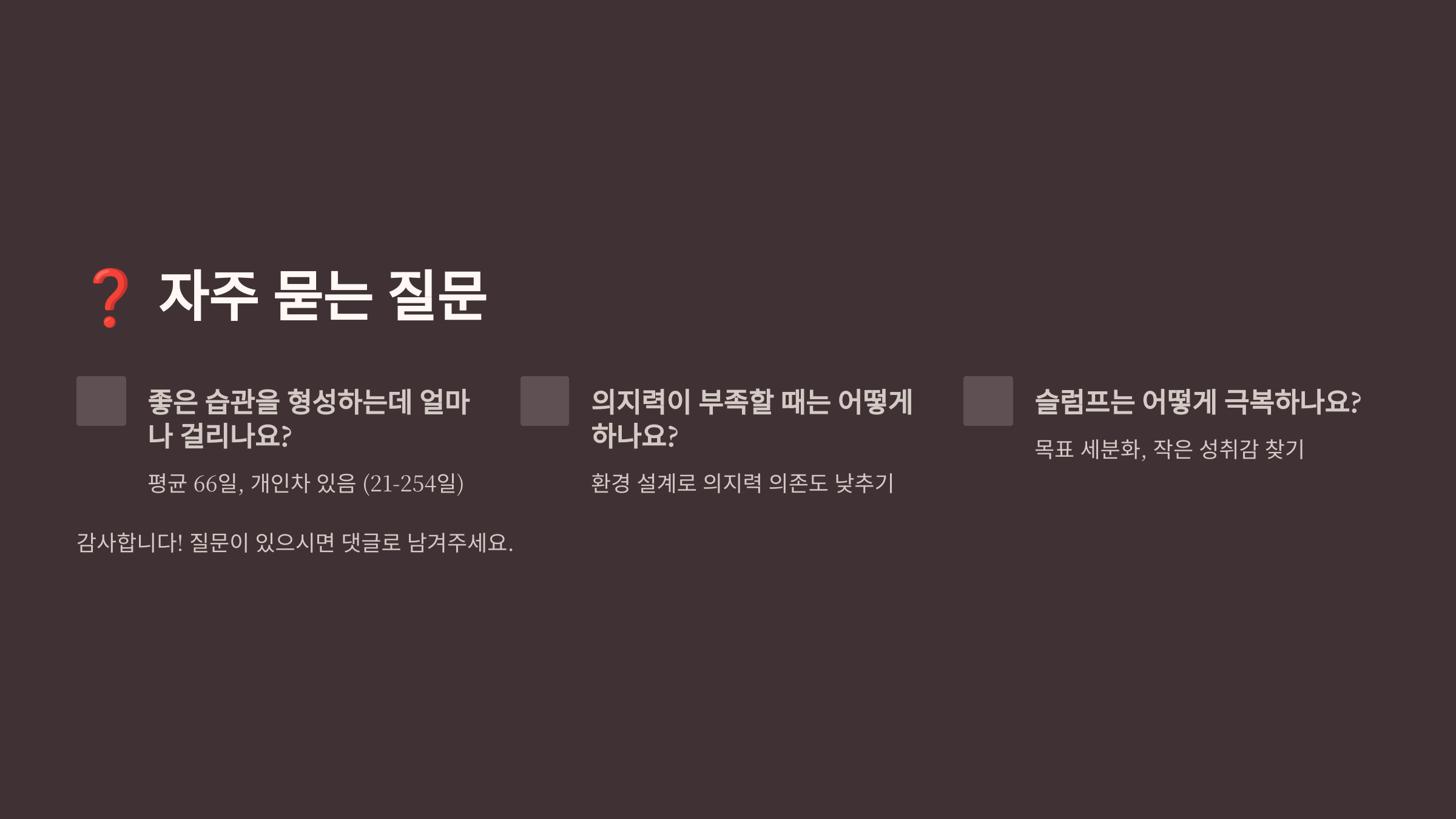 A7. 아주 효과적이에요! 작지만 자주 반복되는 행동이 진짜 습관을 만들어줘요. 어렵지 않기 때문에 더 오래가요.
