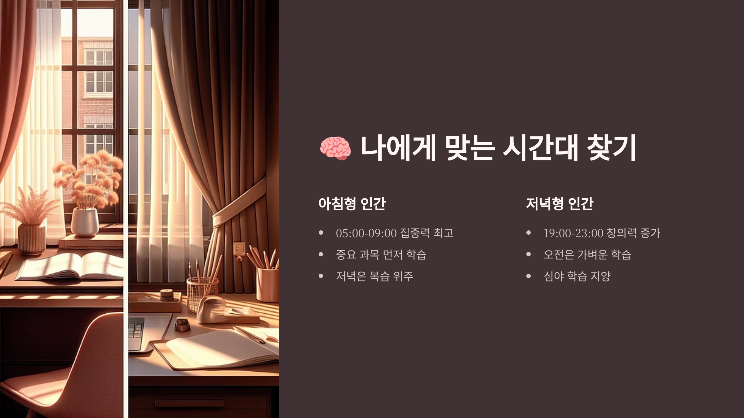 공부는 양보다 타이밍이 중요할 때가 많아요. 사람마다 집중력이 최고조에 이르는 시간이 다르기 때문에, 나에게 가장 잘 맞는 시간대를 찾는 것이 효율적인 공부 습관을 만드는 핵심이에요. 🕐