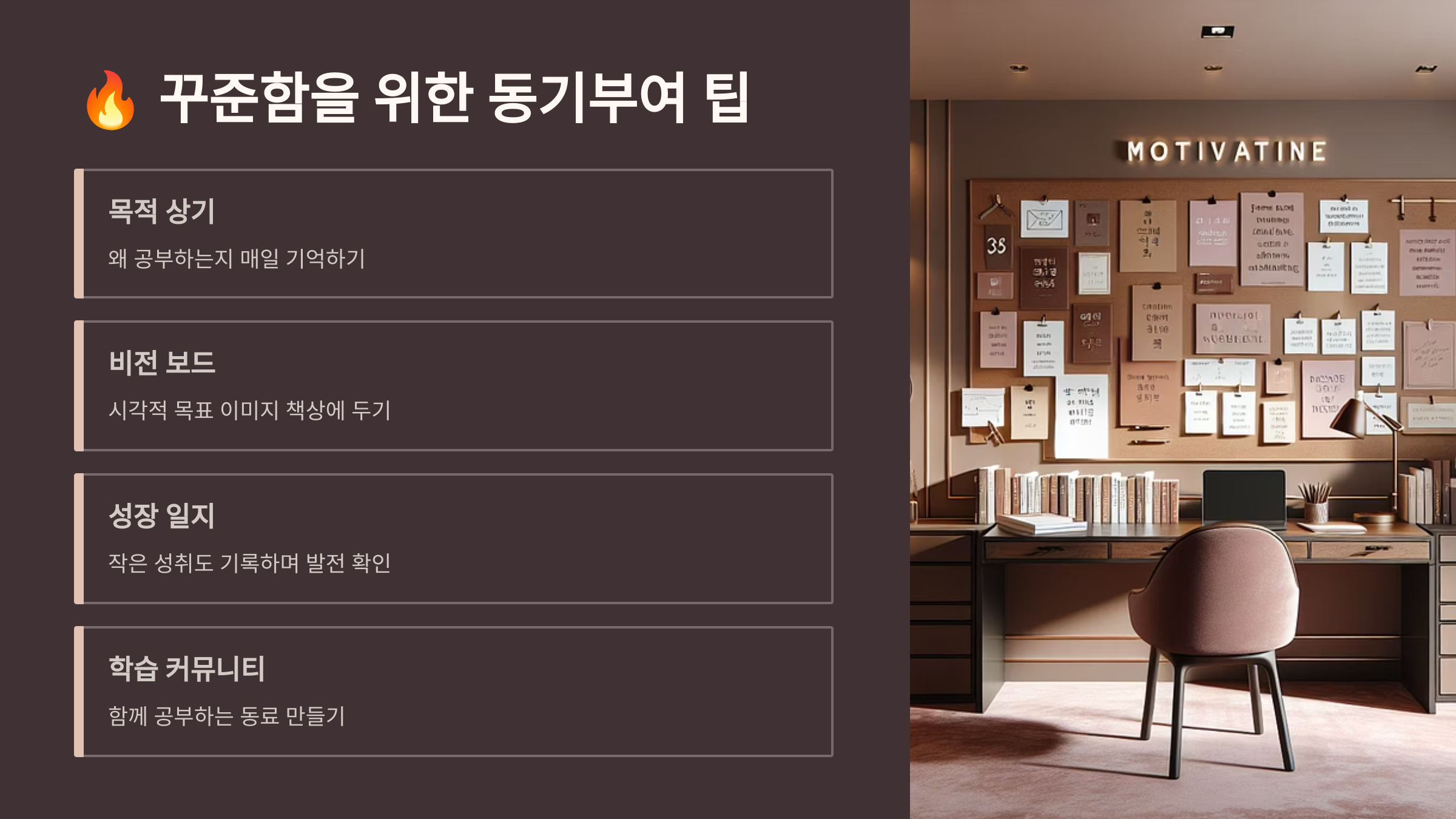 처음에는 열정만으로 시작하지만, 시간이 지나면 열정은 사라지고 ‘습관’과 ‘동기’만 남게 돼요. 이럴 때는 감정이 아닌 구조로 버티는 것이 중요해요. 특히 내가 공부하는 이유를 다시 떠올리는 것만으로도 강력한 동기부여가 될 수 있어요. 🧠