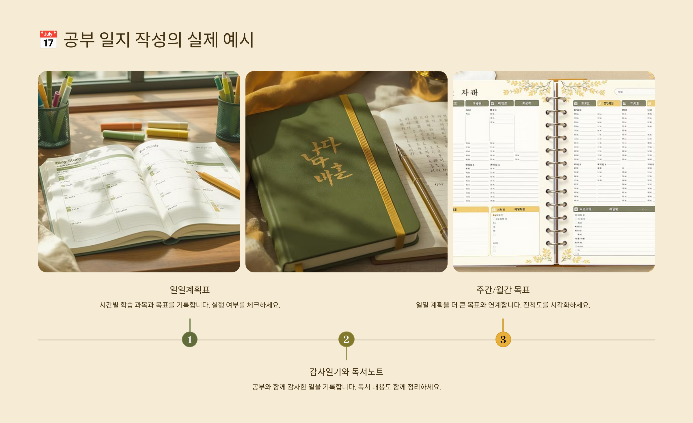 이제 실제로 공부 일지를 어떻게 작성하면 좋은지 예시를 통해 알아볼게요. 매일 똑같은 양식을 쓰지 않아도 돼요. 중요한 건 나에게 맞는 형식을 찾고, 꾸준히 적어나가는 거랍니다. 📝