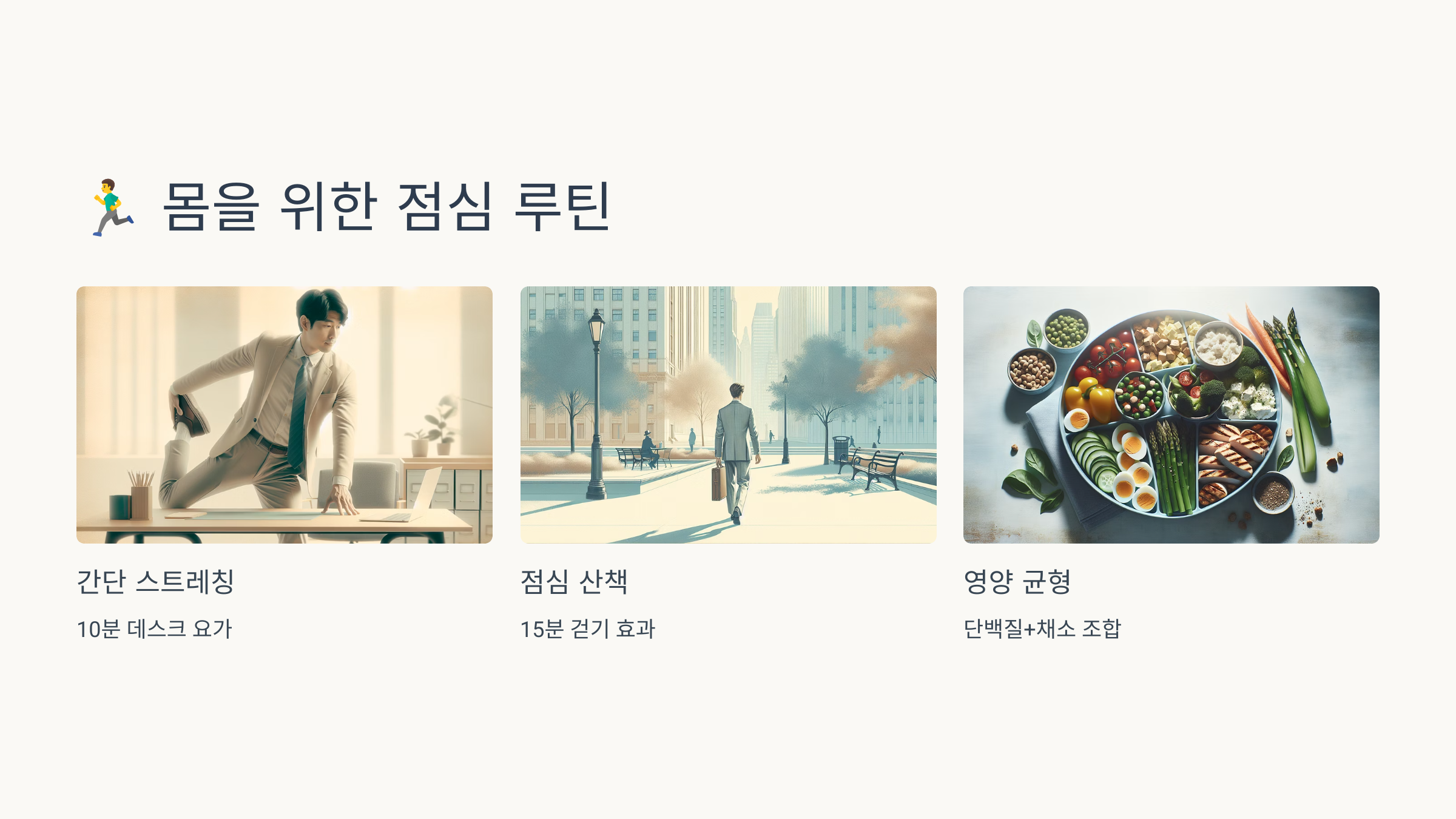 점심시간 루틴을 잘 짜는 건 단순한 계획이 아니라, ‘생활 습관의 디자인’이에요.