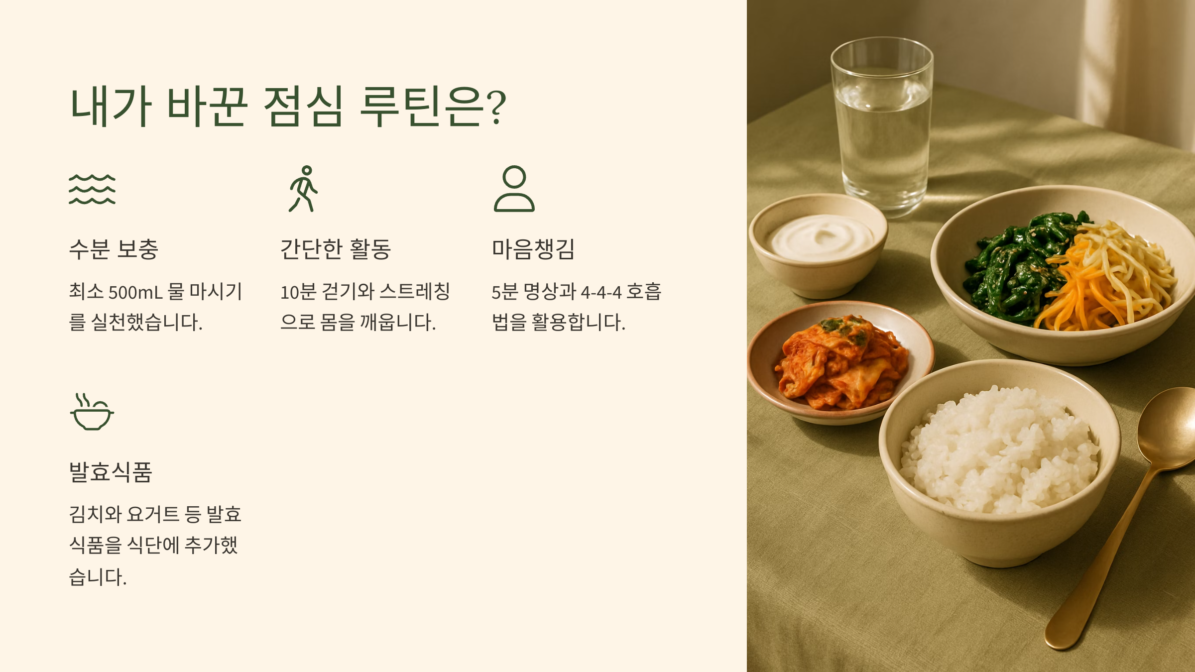 점심시간에 밥만 먹고 스마트폰을 보는 게 익숙했던 저였지만, 어느 날 문득 ‘이대로는 안 되겠다’는 생각이 들었어요. 점심 이후 피로가 몰려오고, 오후가 너무 힘겹게 느껴졌거든요. 그래서 작정하고 딱 한 가지 루틴을 바꾸기로 결심했죠.
