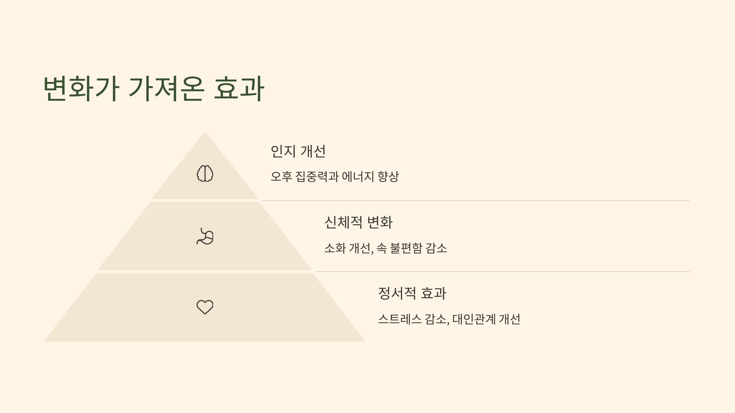 | 집중력 | 오후엔 흐릿하고 멍함 | 오후에도 명확하고 집중 잘 됨 |