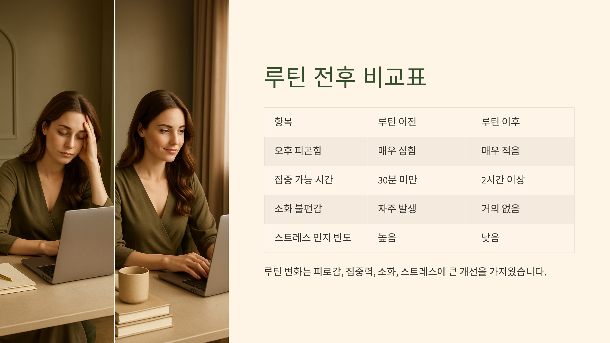 점심시간 루틴을 바꾸고 난 후 어떤 변화가 있었는지를 눈에 보이도록 정리해봤어요. 루틴이 우리 삶에 얼마나 실질적인 영향을 주는지 명확하게 보여주는 내용이에요. 직접 기록해본 결과를 아래 표로 비교했답니다. 📌
