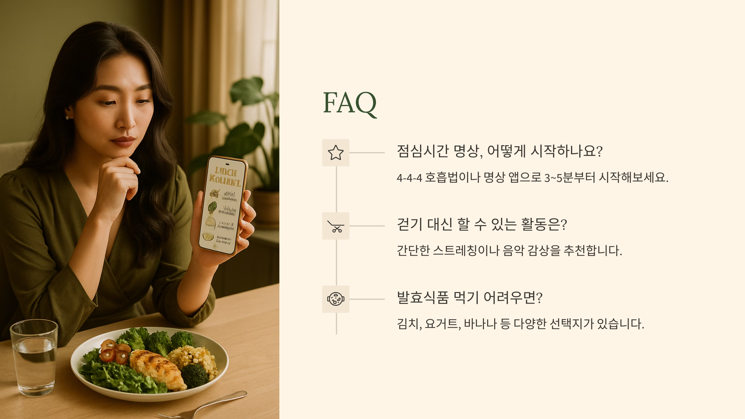 이처럼 직종과 상황은 달라도 ‘의식 있는 점심 루틴’은 누구에게나 긍정적인 영향을 준다는 공통점이 있어요. 루틴을 바꾸는 건 큰 용기나 시간이 필요한 게 아니라, 그냥 ‘오늘 한번 해볼까?’라는 작고 단순한 마음이 시작이에요.