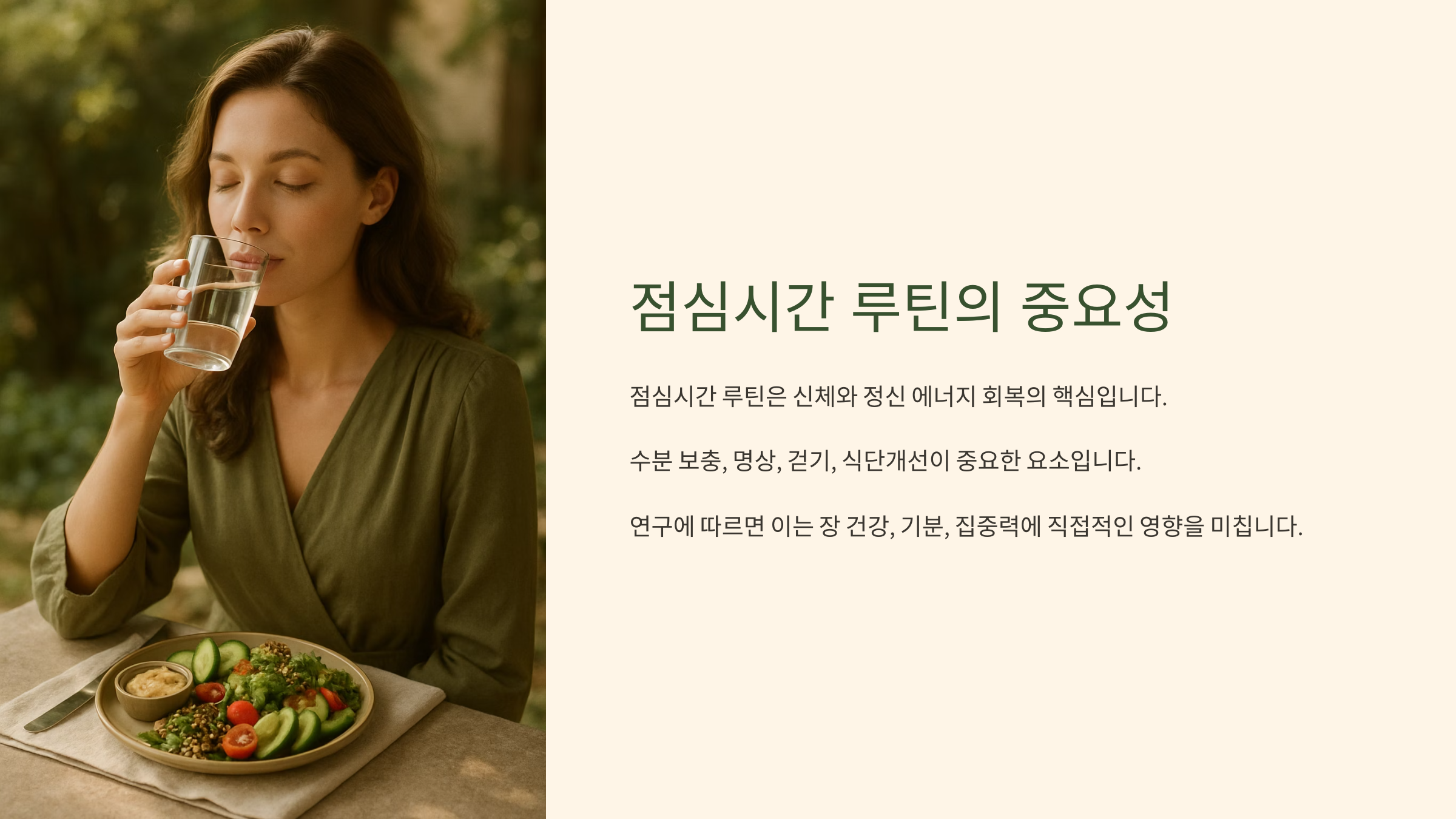 점심시간은 단순한 휴식이 아니라 하루 전체의 에너지를 다시 끌어올릴 수 있는 ‘전환점’이에요. 아침의 업무에 지쳤을 때, 잠시 멈추고 자신을 돌아보는 시간으로 만들 수 있죠. 그런데 많은 직장인과 학생들이 이 귀중한 1시간을 무심코 흘려보내는 경우가 많답니다.