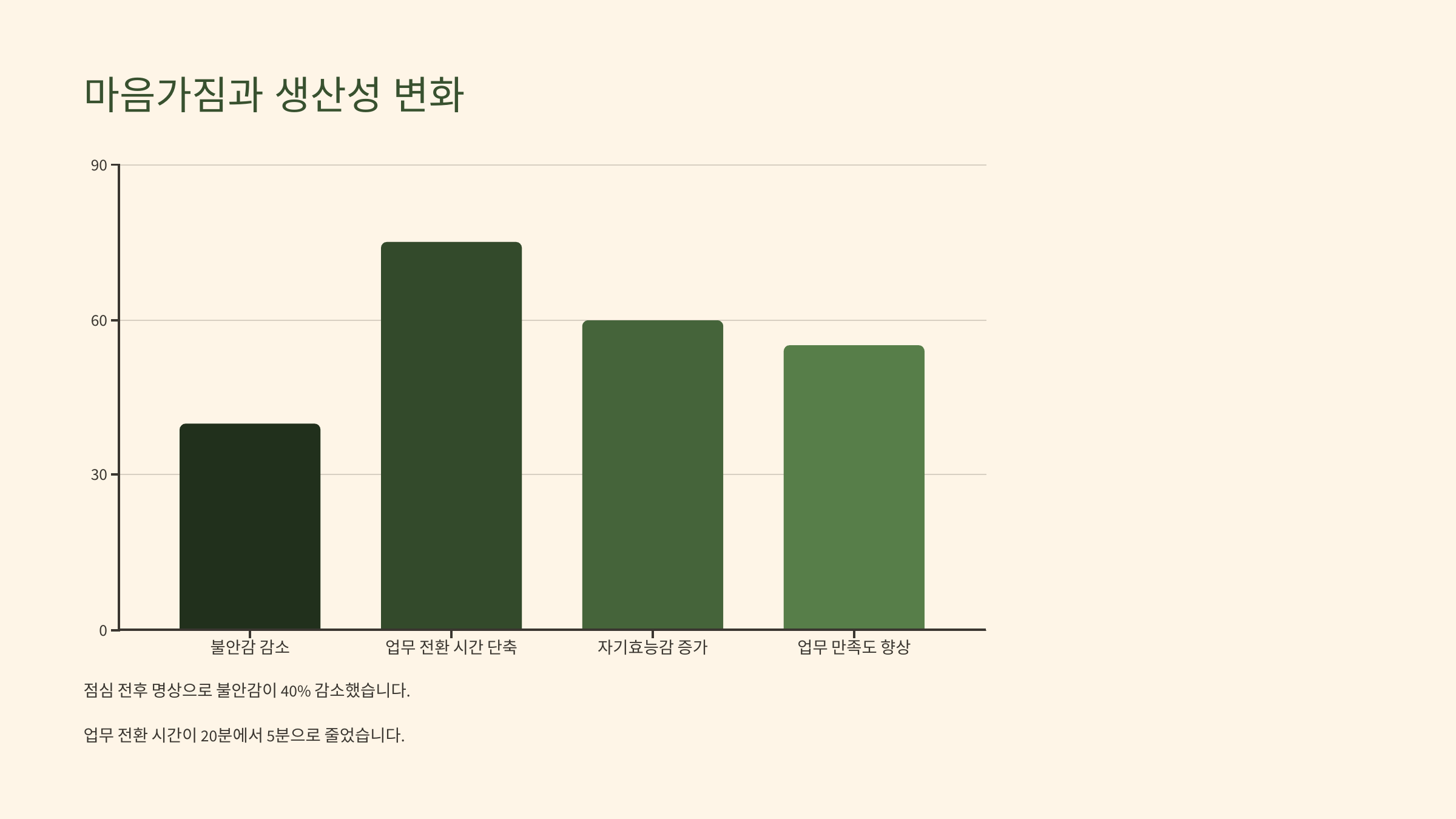 | 집중력 | 업무 중 멍하거나 산만함 | 오후에도 몰입 가능 |