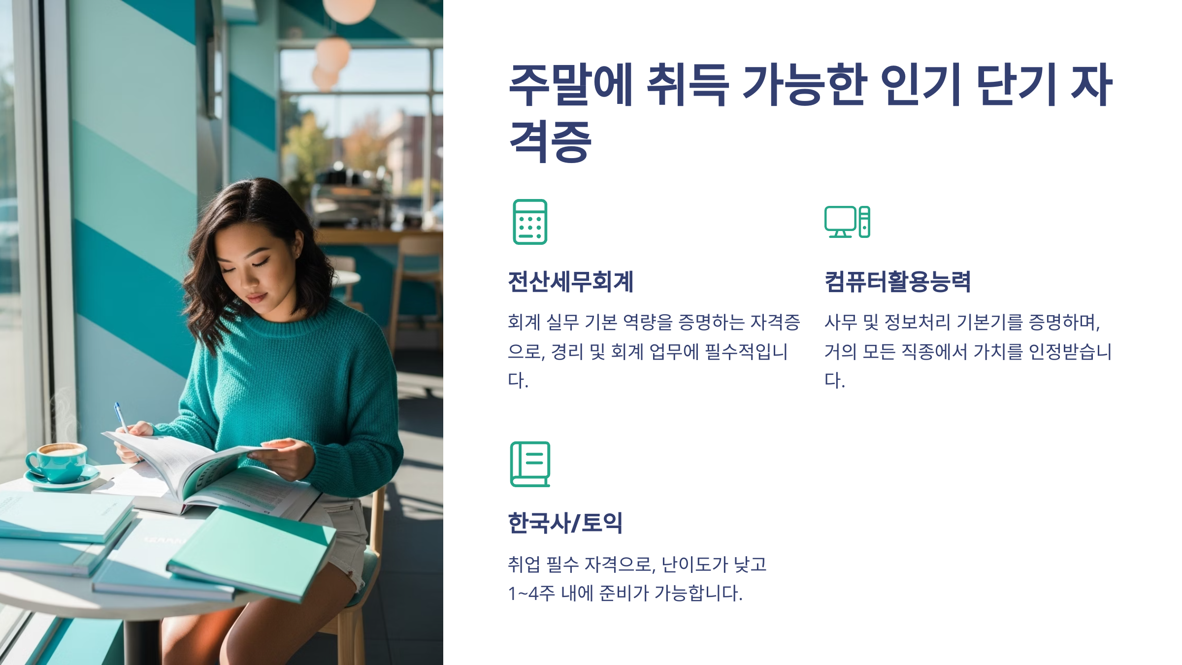 이 외에도 ‘드론 조종 자격증’, ‘반려동물관리사’, ‘심리상담사’, ‘취업상담사’, ‘전산회계 1급’ 같은 자격도 주말 단기 속성으로 가능한 과정들이 많아요. 각각의 자격은 목적과 관심사에 따라 선택하면 돼요.