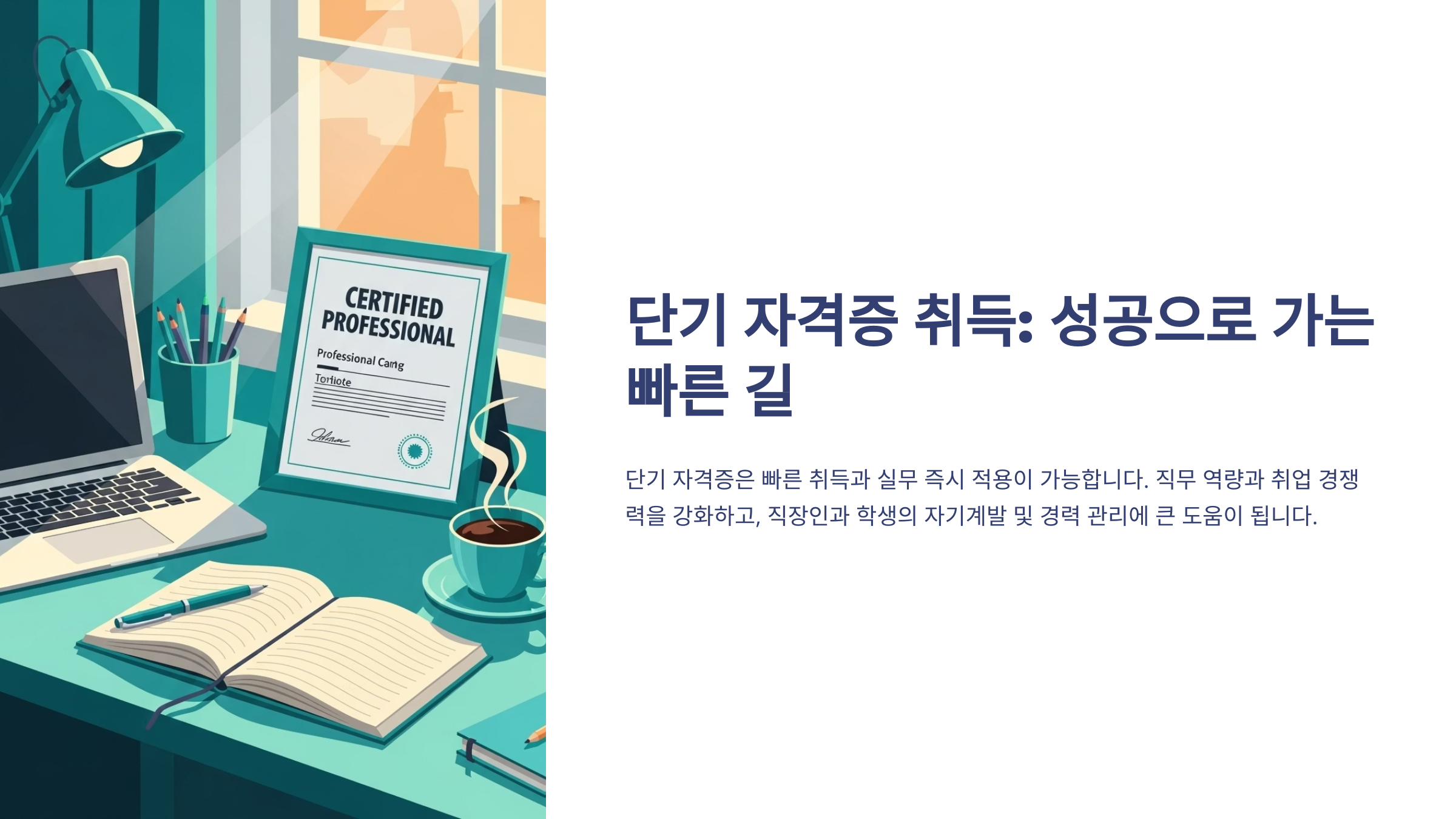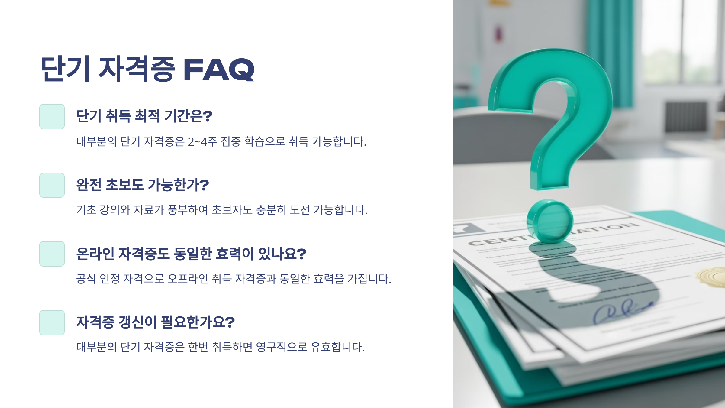 한 마디로 요약하면, 단기 자격증은 작지만 강한 ‘커리어 카드’예요. 지금 바로 시작해도 늦지 않았고, 하나씩 쌓아가면 나중엔 분명한 차이를 만들어줘요. ✨