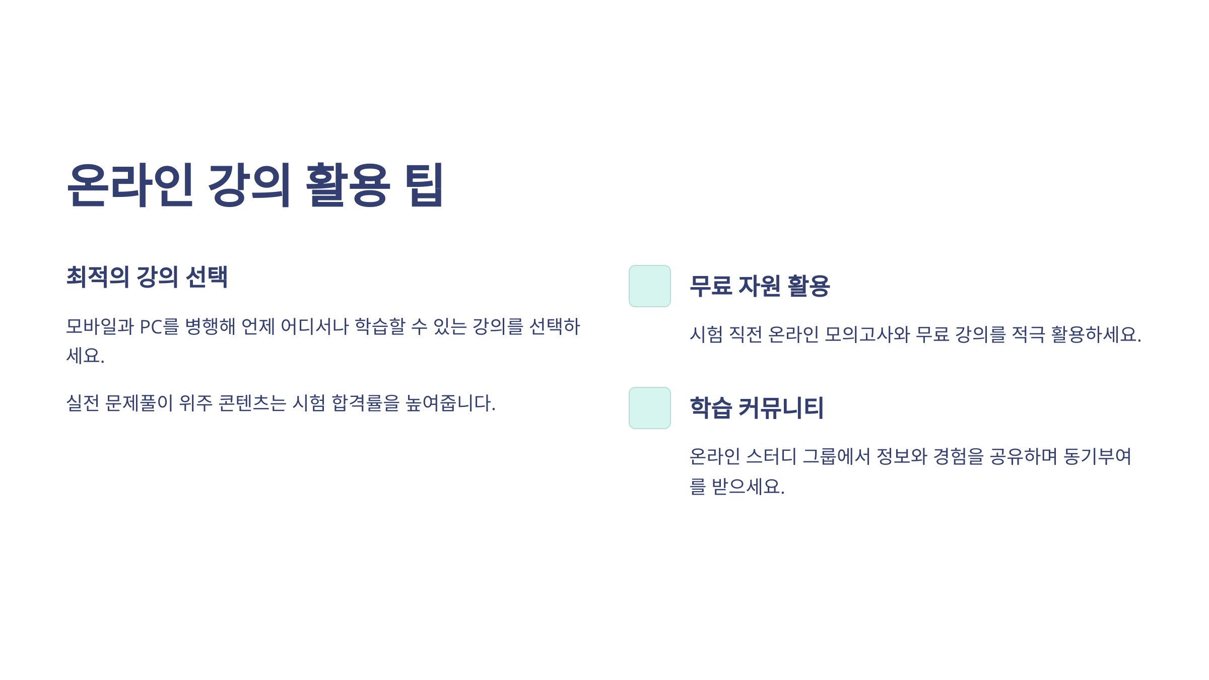 온라인 강의의 가장 큰 장점은 ‘시간과 장소의 제약이 없다’는 점이에요. 출퇴근 시간이나 점심시간, 심지어 잠들기 전 침대에서도 공부할 수 있어요. 그래서 주말 자격증 준비에는 최적의 환경이죠. 🛋️