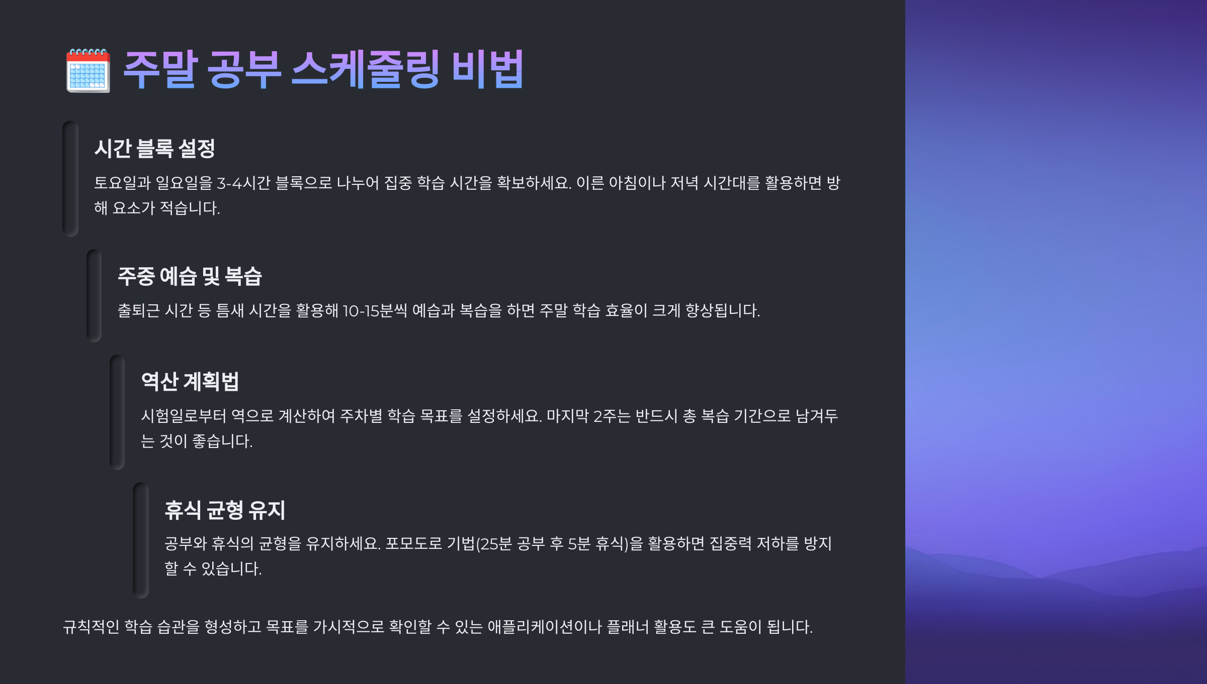 주말이라고 무조건 오래 공부하는 게 능사는 아니에요. 오히려 본인의 라이프스타일과 에너지 흐름에 맞는 시간표를 짜는 게 더 중요하답니다. 지속 가능한 루틴이 핵심이에요.