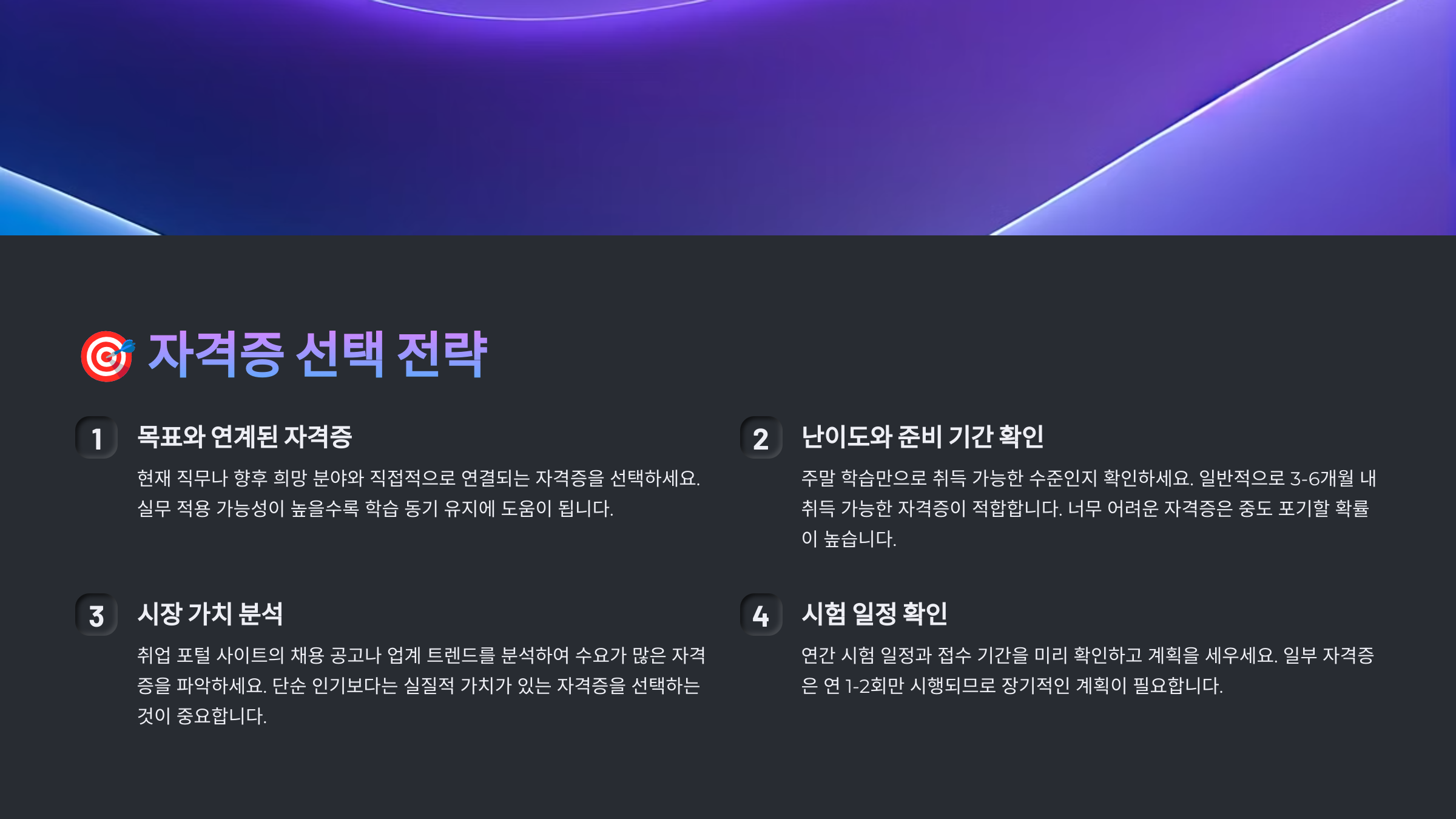 자격증 선택 시 고려할 수 있는 3단계 전략이 있어요. ① 직무 연관성, ② 합격 가능성, ③ 시험 일정이에요. 이 세 가지 요소를 체크하면 낭비 없이 효율적으로 선택할 수 있어요.