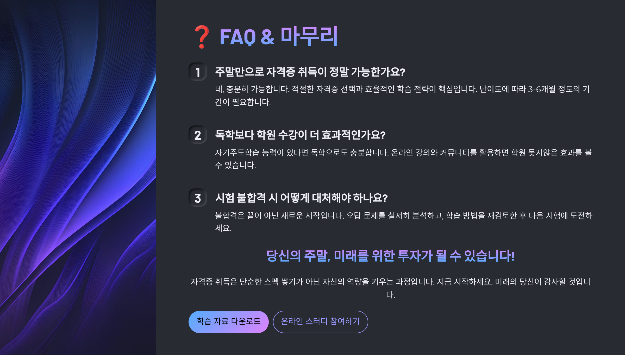 지금까지 사례를 통해 실제 주말 공부가 얼마나 효과적인지 확인하셨다면, 마지막 세션에서는 추천 자격증과 함께 가장 많이 묻는 FAQ까지 정리해드릴게요!