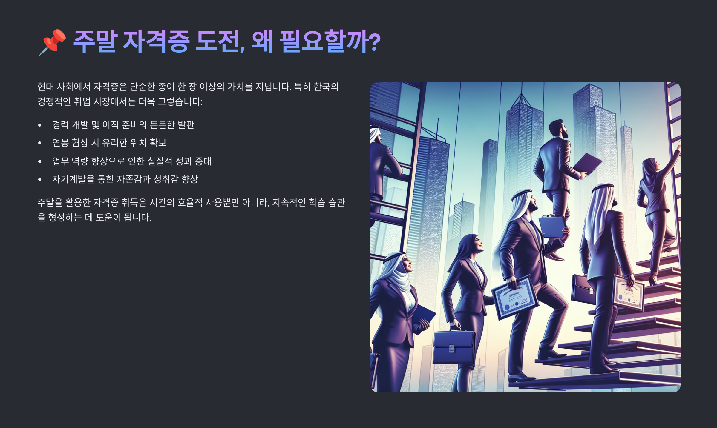 이렇게 중요한 주말 자격증 전략, 어떻게 시작해야 할까요? 다음 문단부터는 자격증을 고르는 방법부터 구체적으로 알려줄게요. 기대해도 좋아요 😊