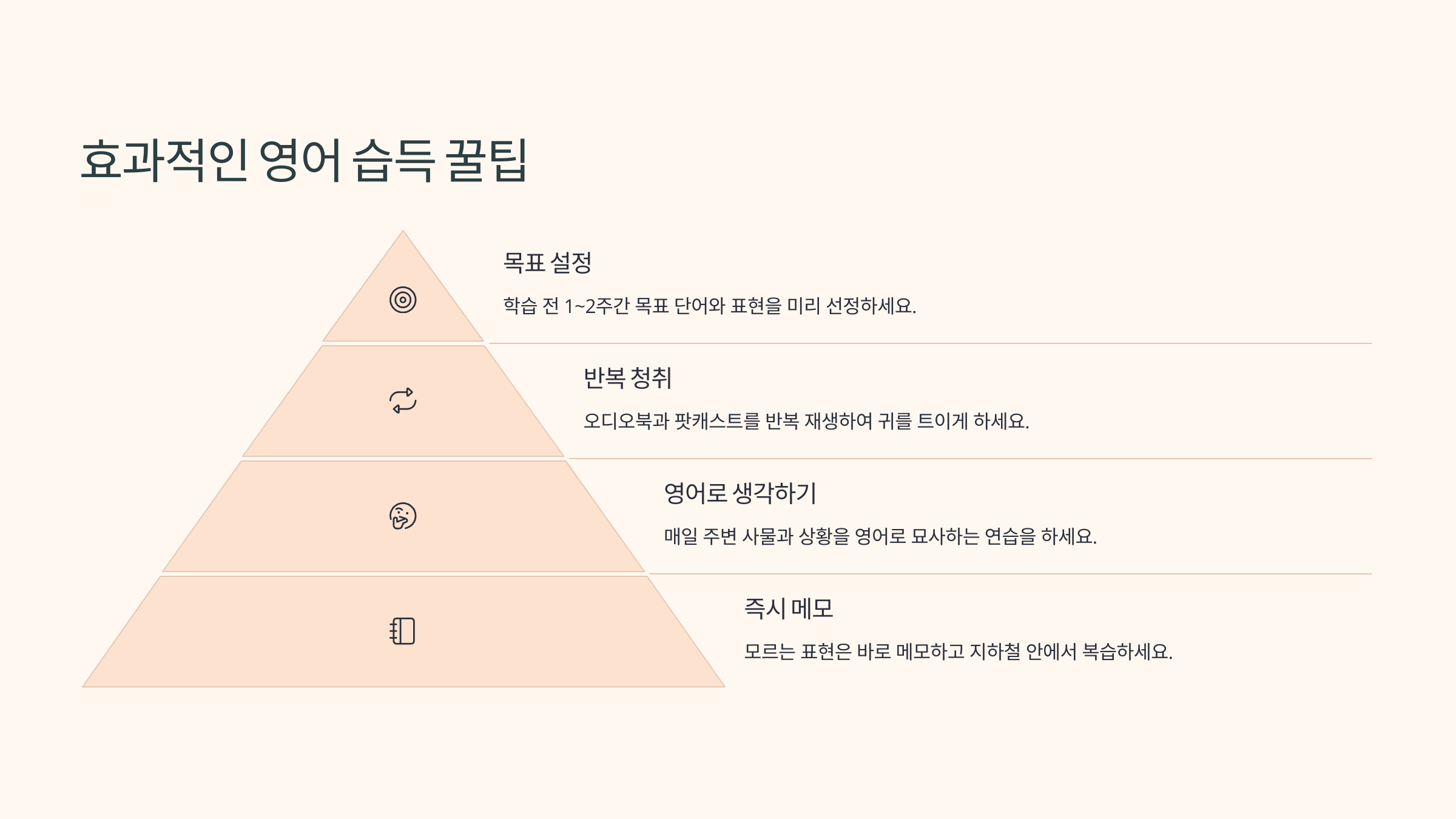 또 하나는 ‘짧고 자주’예요. 한 번에 1시간씩 하는 것보다, 15분씩 자주 영어를 접하면 뇌가 더 빠르게 적응해요. 출근길이나 퇴근길에 매일 반복하면 자연스럽게 습관이 되는 거죠. 📚