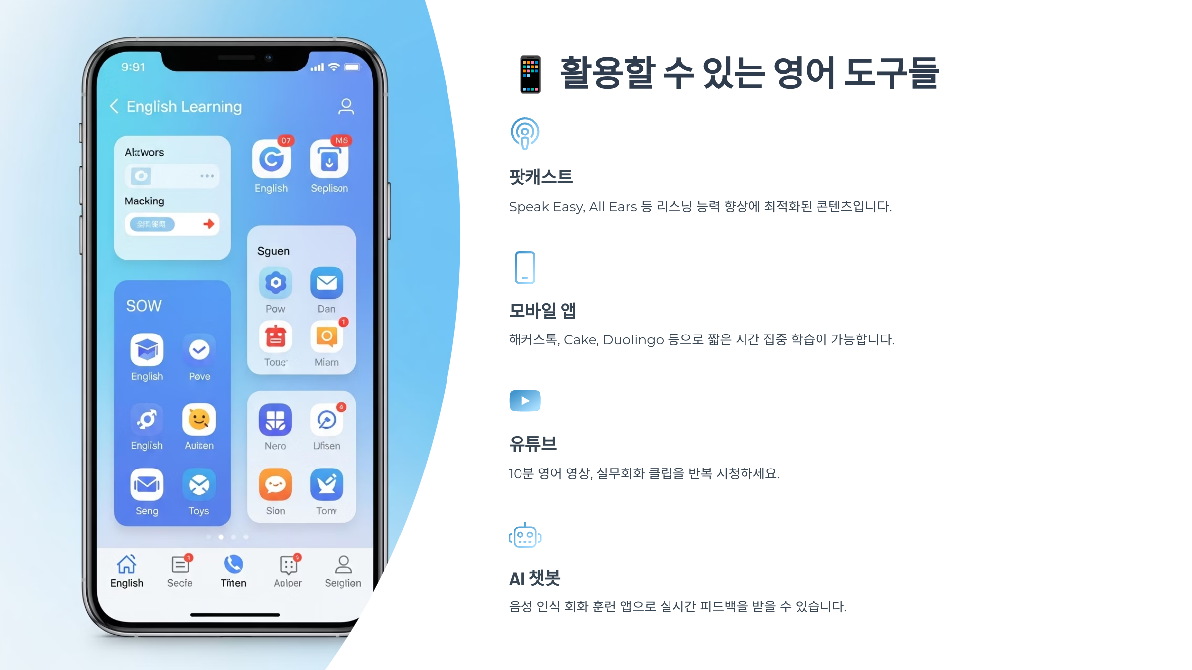 다섯 번째는 'AI 회화 앱'이에요. ELSASpeak, Speakly 같은 앱은 발음까지 잡아주고 실제 대화를 연습할 수 있어서 출근길 틈틈이 말하기 훈련에 제격이에요. 특히 ELSA는 발음을 채점해줘서 교정 효과도 기대할 수 있어요.