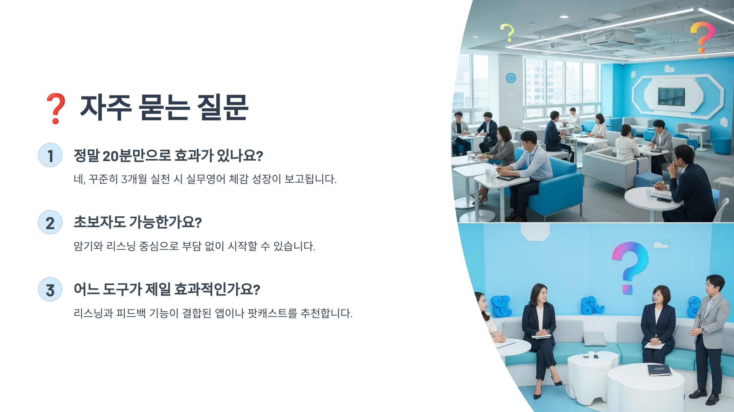 A8. 보통 2~3주면 듣기 실력이 오르고, 4~6주 후에는 말하기 자신감도 생겨요. 꾸준히만 하면 누구나 가능해요!
