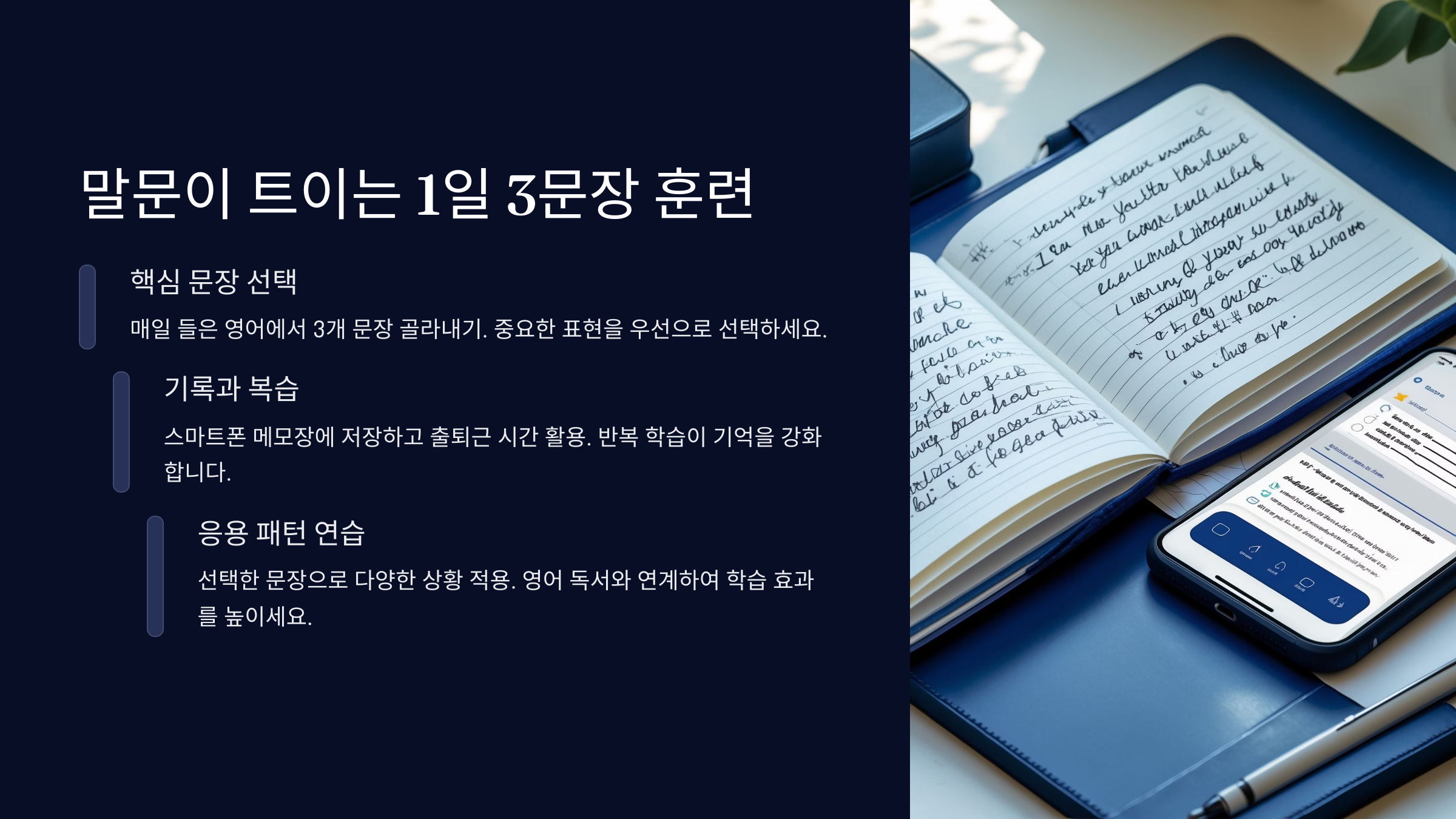 영어는 결국 말해봐야 실력이 느는 법이에요. 그중에서도 ‘3문장 루틴’은 회화 초보자에게 강력 추천하는 방식이에요. 오늘 하루 쓸 법한 표현 3문장을 골라 암기하는 거죠.