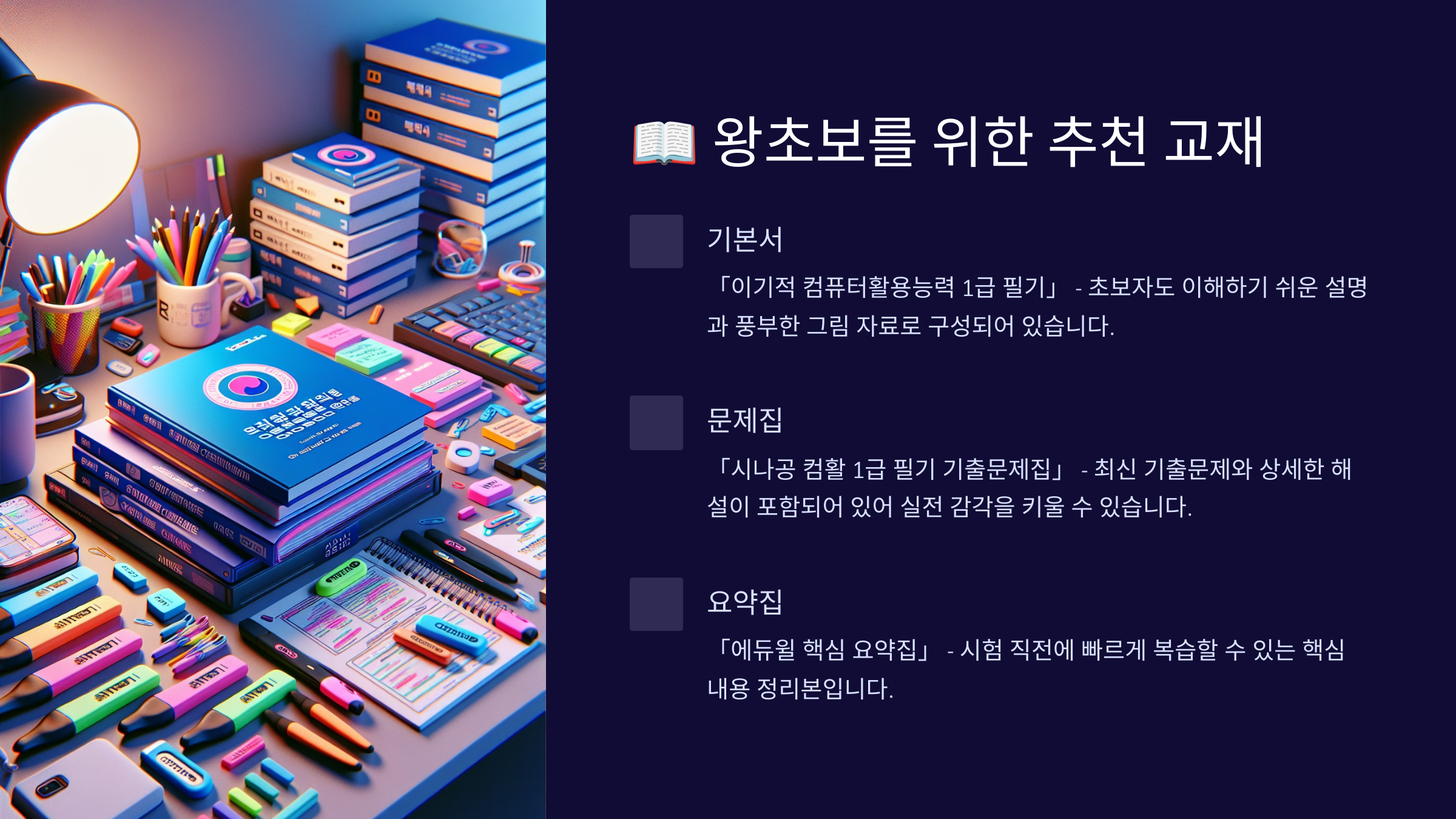 컴활 1급 필기를 단기간에 끝내고 싶다면, 무작정 책만 들여다보는 방식은 비효율적이에요. 핵심 개념을 빠르게 외우는 법과 기출 반복을 효율적으로 결합하는 게 제일 좋아요. 특히 하루에 최소 100문제 이상 풀면서, 틀린 문제 중심으로 복습하는 방법이 가장 빠른 합격 루트예요. 🚀