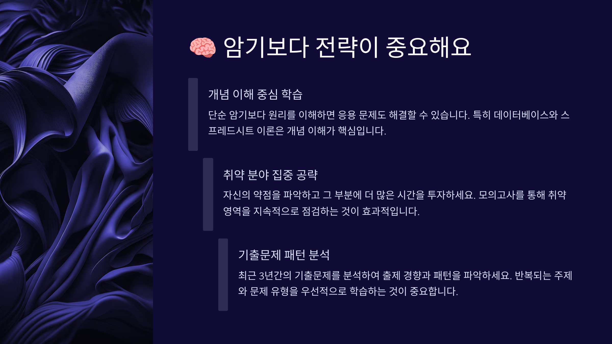 스프레드시트는 엑셀에서 사용하는 수식과 함수, 셀 서식, 차트 작성 등을 묻는 문제들이 주를 이루고, 데이터베이스는 ERD, SQL 구문, 관계형 데이터 구조 등 조금 더 이론 중심의 내용을 포함해요. 이 두 과목은 반복되는 패턴이 있어서 기출 풀이만 제대로 해도 상당한 점수를 확보할 수 있어요.