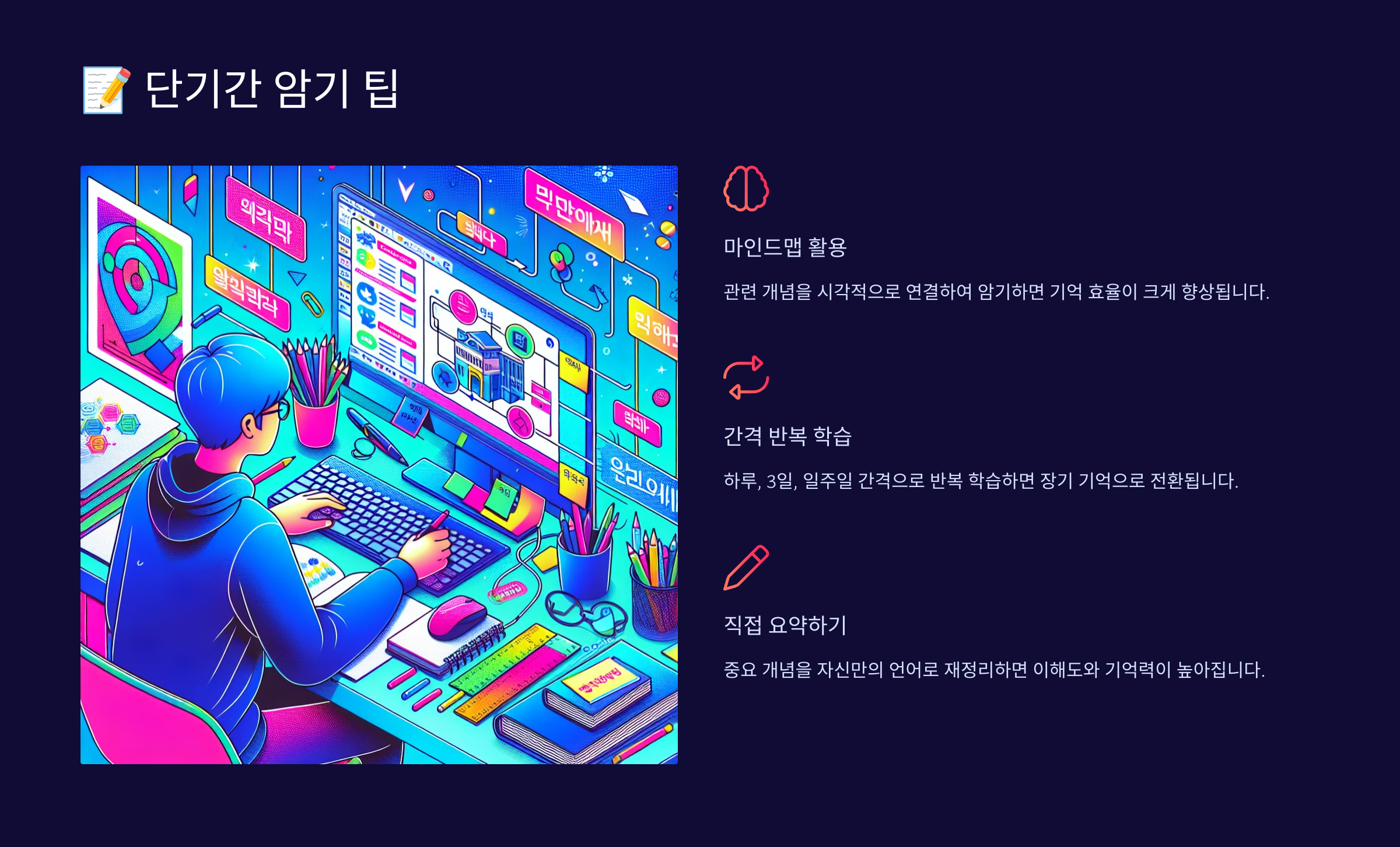교재 선택이 끝났다면, 본격적으로 단기간에 효과적으로 외우는 법에 대해 알아볼 차례예요. 바로 다음 세션에서 알려드릴게요! 💪