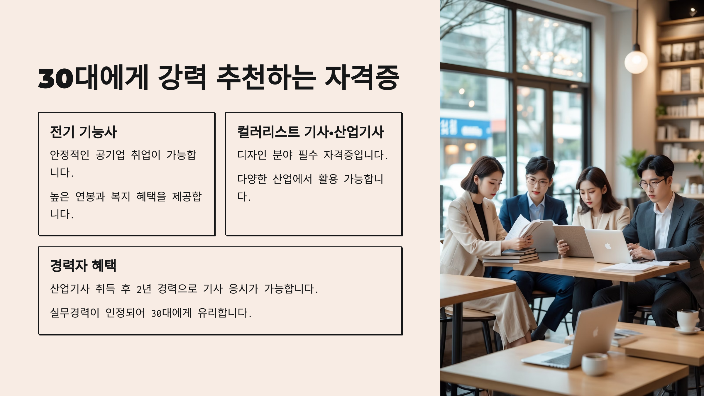 그래서 이번 글에서는 실제로 어떤 자격증이 30대에게 도움이 되는지, 왜 지금 준비해야 하는지, 그리고 어떻게 준비하면 되는지 아주 구체적으로 알려드릴게요!