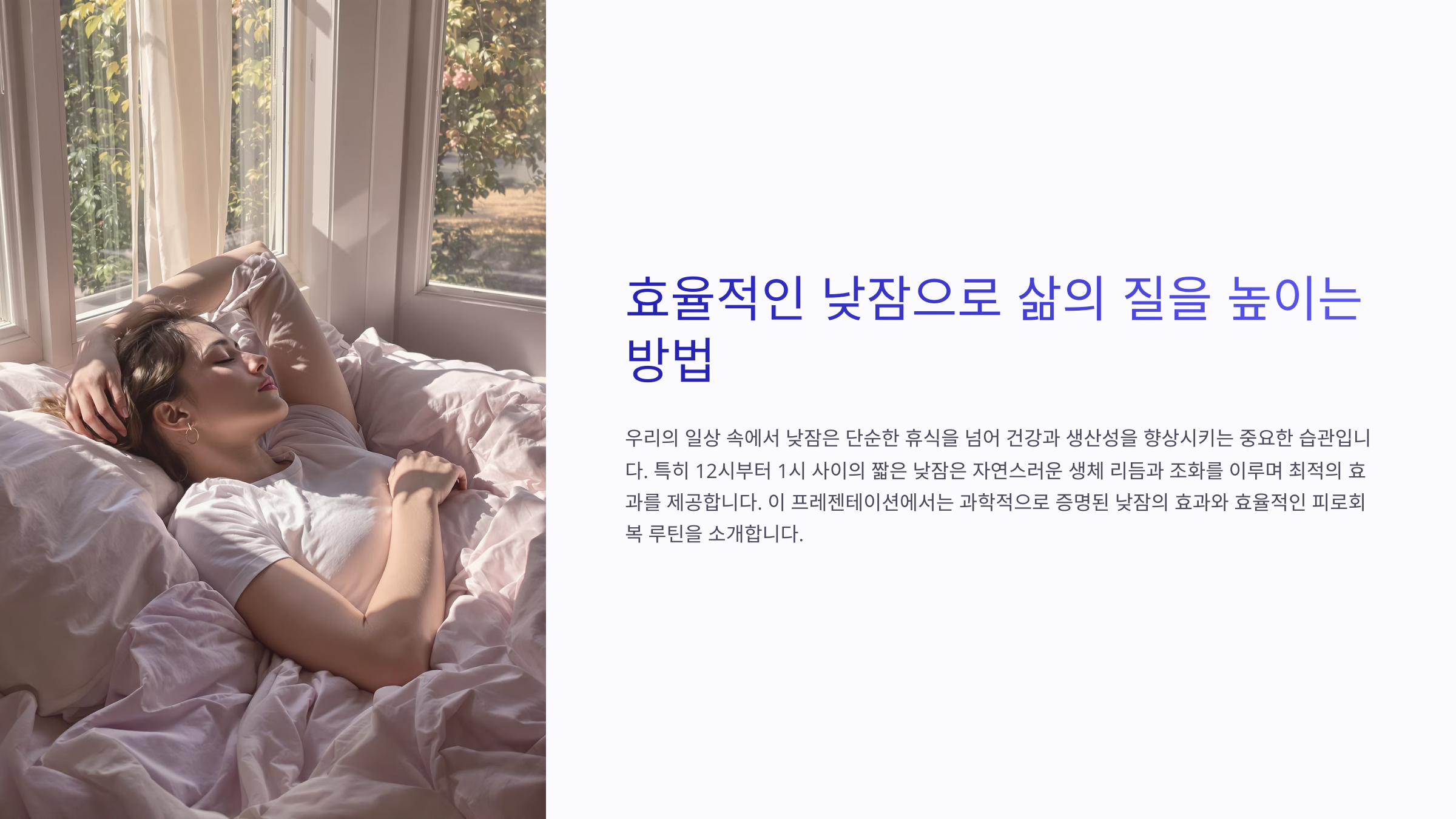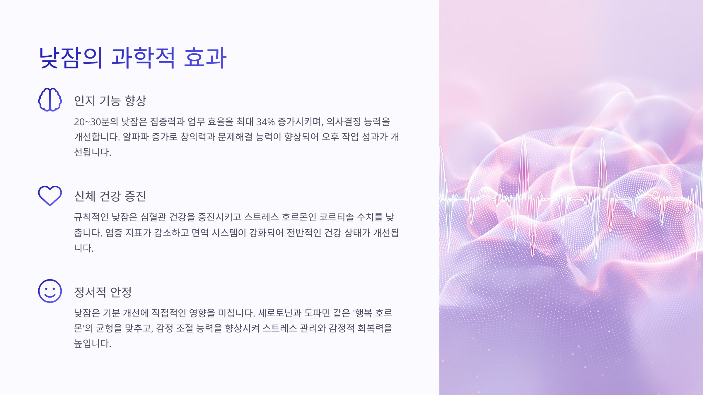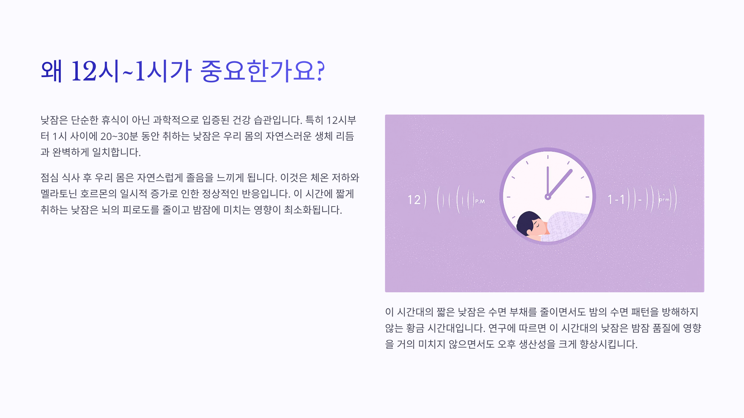 😴 **낮잠 효과는 과학적이에요** : NASA, 하버드 등 다양한 연구에서 낮잠이 집중력, 기억력, 심장 건강에 긍정적인 영향을 준다고 밝혀졌어요.