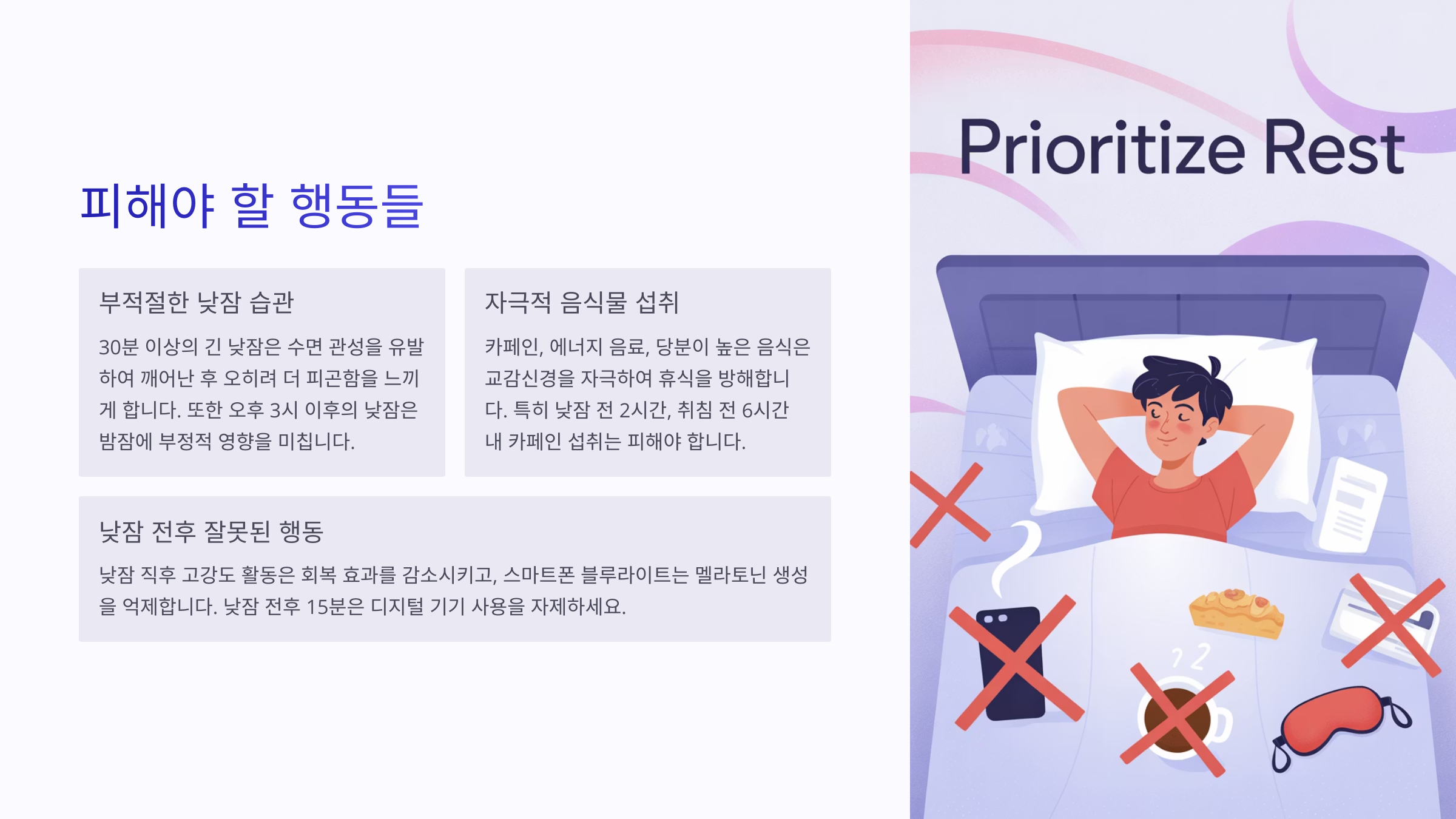 | 피해야 할 것 | 과식, 과도한 스마트폰, 깊은 낮잠 |