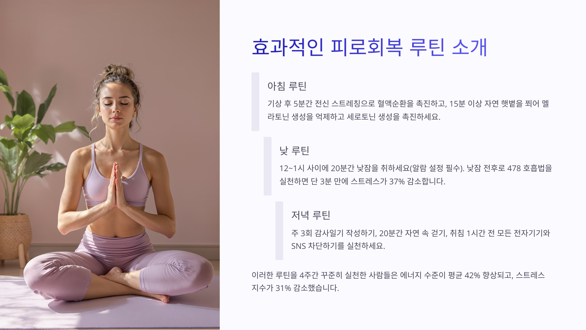 🌿 **루틴 5단계 요약** 1) 알람 맞추기 → 2) 스트레칭 → 3) 눈 감고 20분 이완 → 4) 물 한 잔 + 햇빛 → 5) 업무 전환 준비