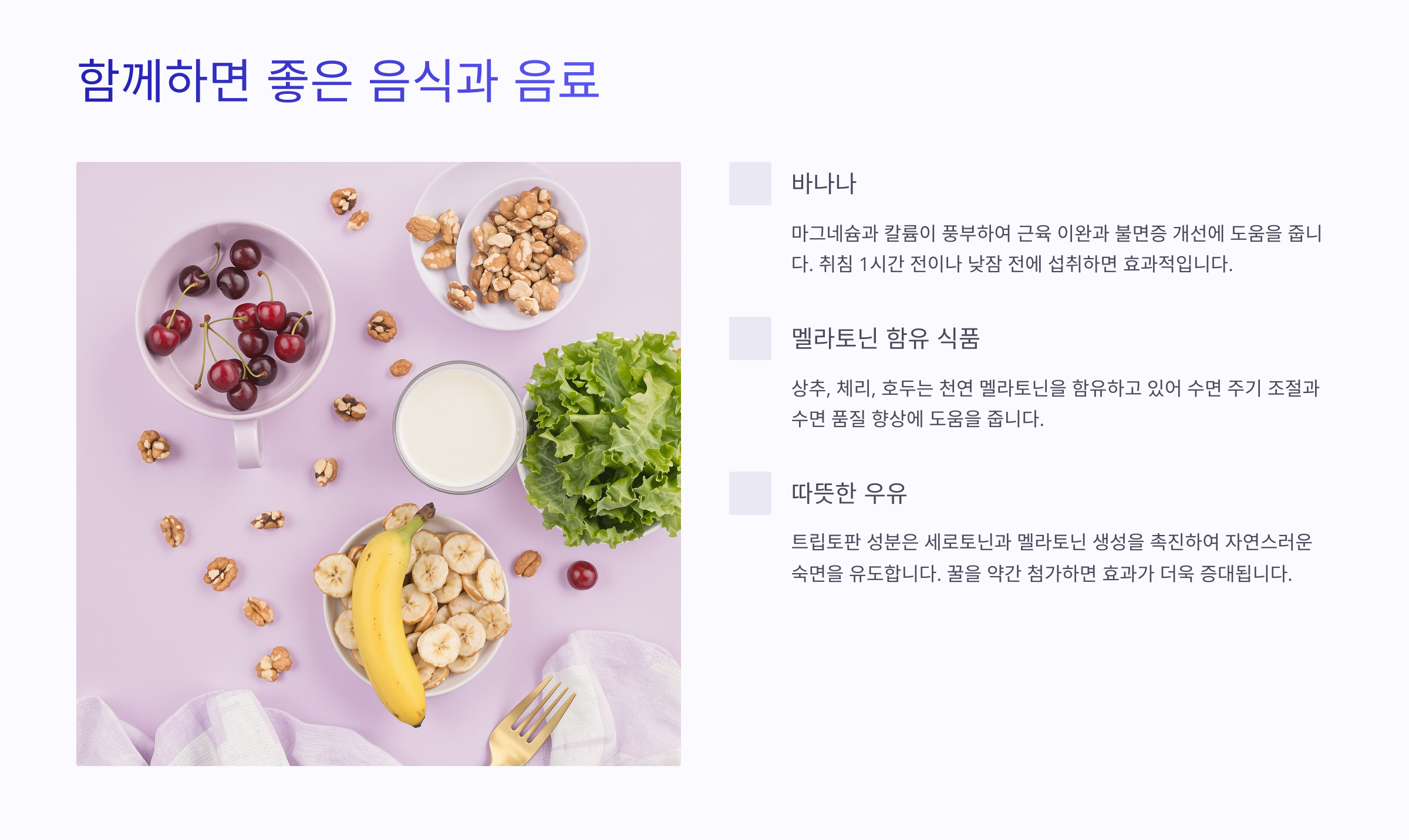 | 좋은 음식 | 바나나, 견과류, 루이보스차 |
